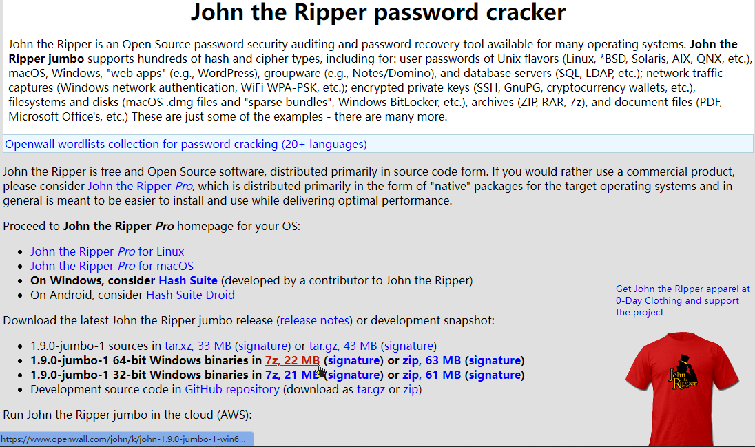 - John the Ripper安装包:https://www.openwall.com/john/k/john-1.9.0-jumbo-1-win64.7z