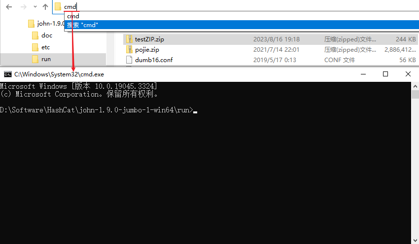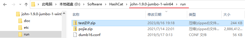 加密文件(例:testZIP.zip)放置该目录下:john-1.9.0-jumbo-1-win64\run