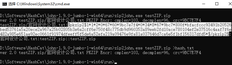 不同的加密文件用不同的提取执行文件,zip用的是:zip2john.exe、空格、后面跟加密文件:testZIP.zip