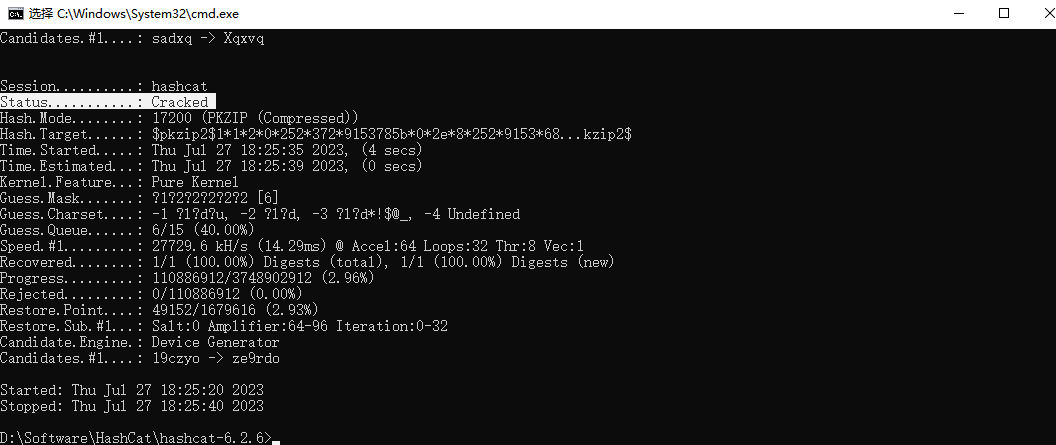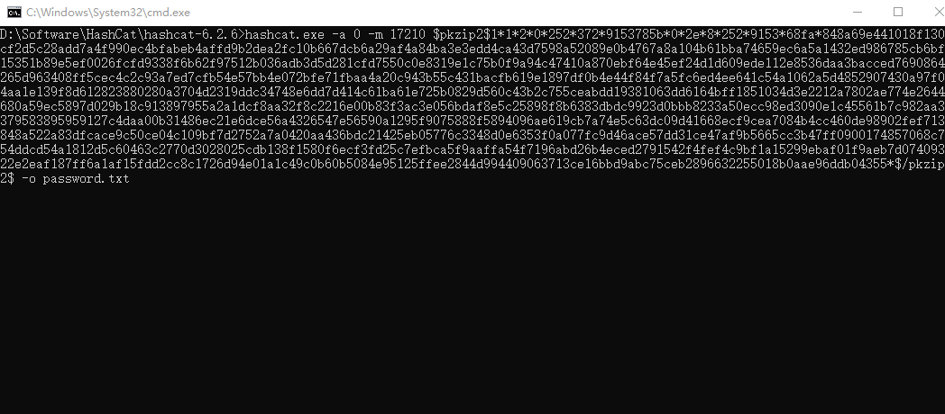 1 | hashcat.exe -a 0 -m 17210 $pkzip2$1*1*2*0*15*9*40eb277b*26*2f*0*15*40eb*a1b6*ceb5ab2188f4978bfb544b297bc55bc3feec7fb46e*$/pkzip2$ -o password.txt |