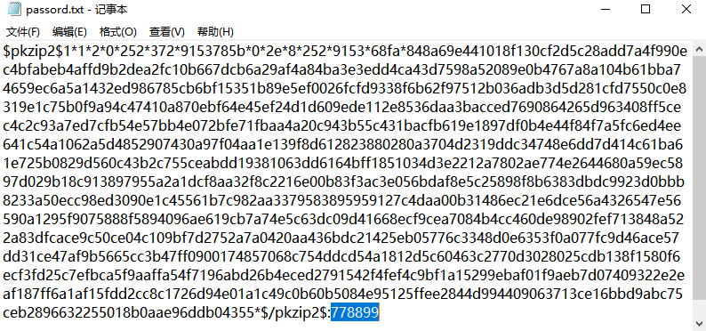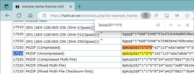 解决办法:用获得的前半段hash值($pkzip2$1*1*2*0),找匹配的hash模式(17210) https://hashcat.net/wiki/doku.php?id=example_hashes