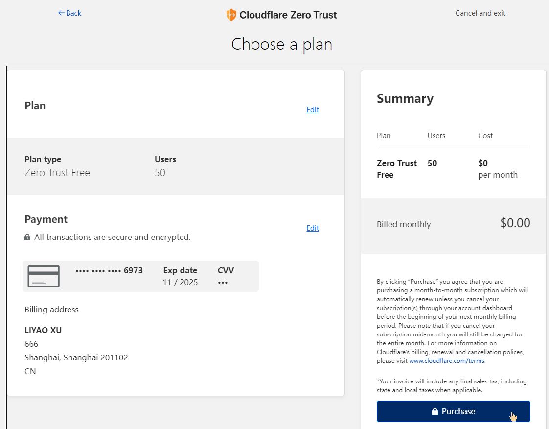 - 点击购买,得有一张Visa信用卡来通过验证步骤,实际收费为0