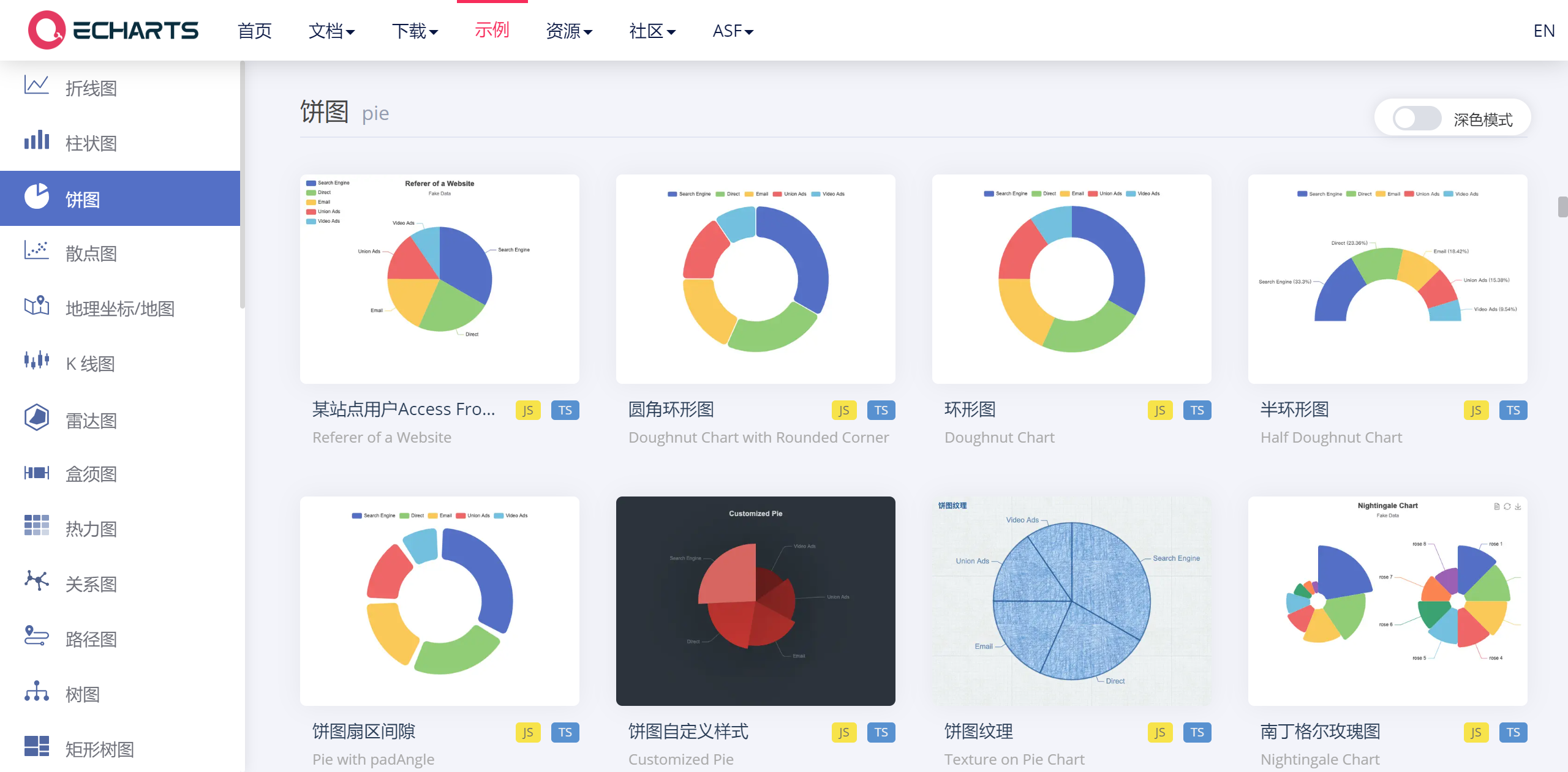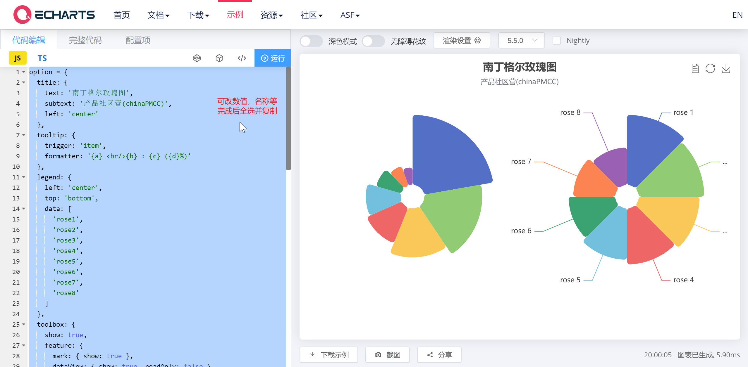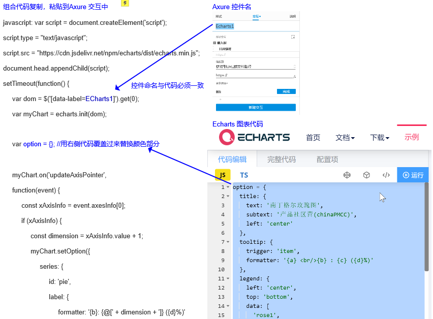 | javascript: var script = document.createElement('script'); script.type = "text/javascript"; script.src ="https://cdn.jsdelivr.net/npm/echarts/dist/echarts.min.js"; document.head.appendChild(script); setTimeout(function(){ var dom =$('[data-label=ECharts1]').get(0); var myChart = echarts.init(dom); var option = { title: { text: '南丁格尔玫瑰图', subtext: '产品社区营(chinaPMCC)', left: 'center' }, tooltip: { trigger: 'item', formatter: '{a} <br/>{b} : {c} ({d}%)' }, legend: { left: 'center', top: 'bottom', data: [ 'rose1', 'rose2', 'rose3', 'rose4', 'rose5', 'rose6', 'rose7', 'rose8' ] }, toolbox: { show: true, feature: { mark: { show: true }, dataView: { show: true, readOnly: false }, restore: { show: true }, saveAsImage: { show: true } } }, series: [ { name: 'Radius Mode', type: 'pie', radius: [20, 140], center: ['25%', '50%'], roseType: 'radius', itemStyle: { borderRadius: 5 }, label: { show: false }, emphasis: { label: { show: true } }, data: [ { value: 40, name: 'rose 1' }, { value: 33, name: 'rose 2' }, { value: 28, name: 'rose 3' }, { value: 22, name: 'rose 4' }, { value: 20, name: 'rose 5' }, { value: 15, name: 'rose 6' }, { value: 12, name: 'rose 7' }, { value: 10, name: 'rose 8' } ] }, { name: 'Area Mode', type: 'pie', radius: [20, 140], center: ['75%', '50%'], roseType: 'area', itemStyle: { borderRadius: 5 }, data: [ { value: 30, name: 'rose 1' }, { value: 28, name: 'rose 2' }, { value: 26, name: 'rose 3' }, { value: 24, name: 'rose 4' }, { value: 22, name: 'rose 5' }, { value: 20, name: 'rose 6' }, { value: 18, name: 'rose 7' }, { value: 16, name: 'rose 8' } ] } ] }; myChart.on('updateAxisPointer', function (event) { const xAxisInfo = event.axesInfo[0]; if (xAxisInfo) { const dimension = xAxisInfo.value + 1; myChart.setOption({ series: { id: 'pie', label: { formatter: '{b}: {@[' + dimension + ']} ({d}%)' }, encode: { value: dimension, tooltip: dimension } } }); } }); if (option && typeof option === "object"){ myChart.setOption(option, true); }}, 800);
