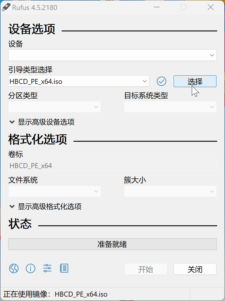 运行启动工具(rufus-4.5.exe),点击选择已下载的HBCD_PE_x64.iso,点击开始