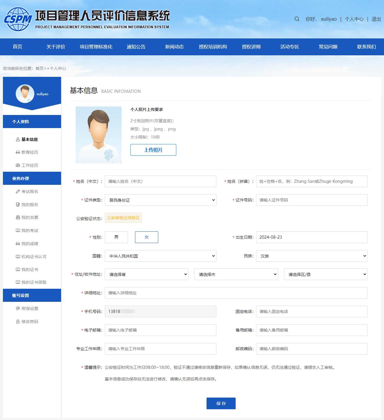 - 上传照片(蓝底2寸证件照),照片与证书上照片需要一致。