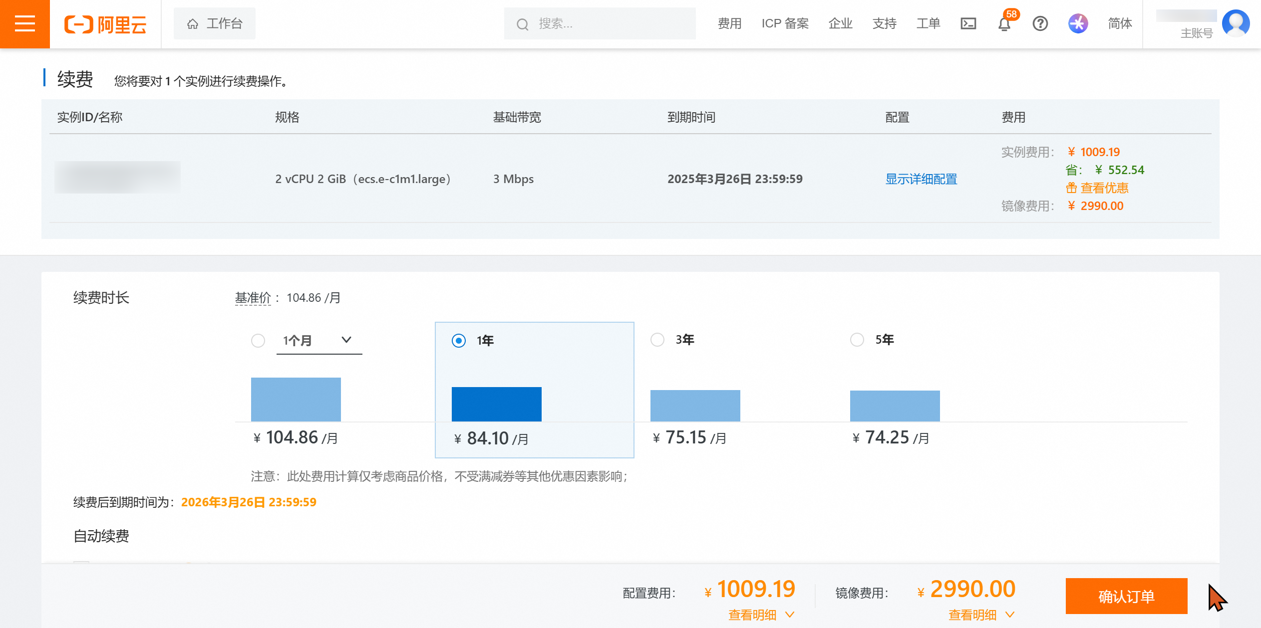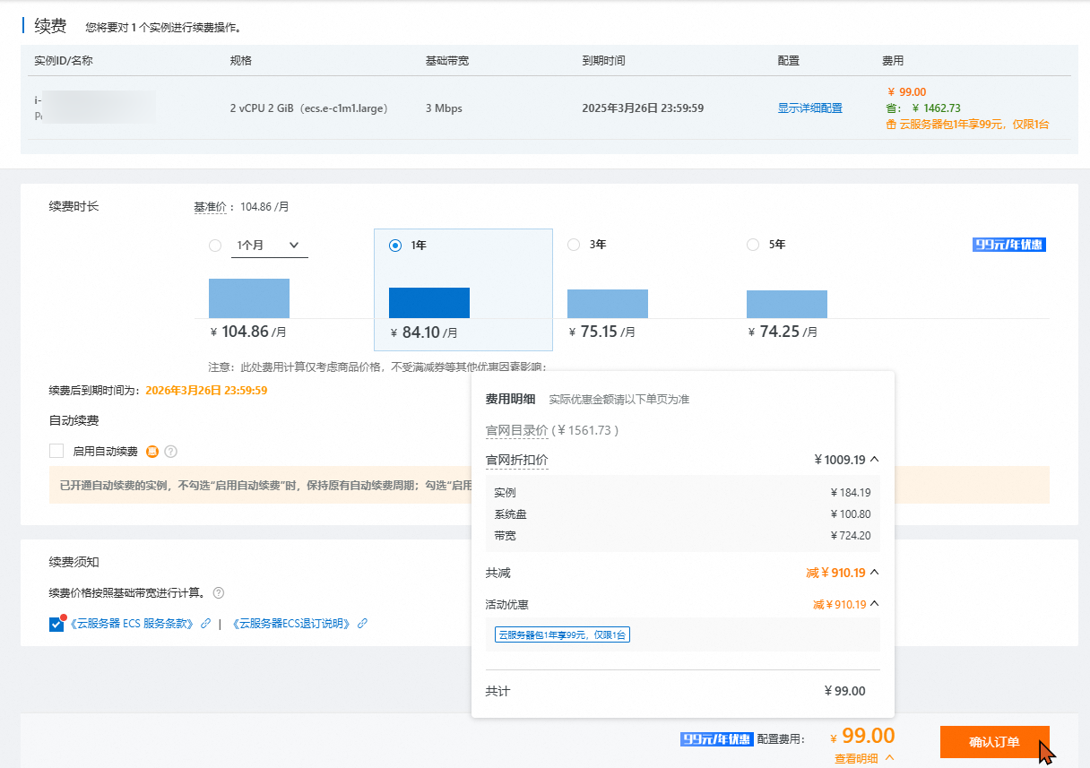 当前续费为一个订单了,且仍然是99优惠价,点击确认订单,进行支付。