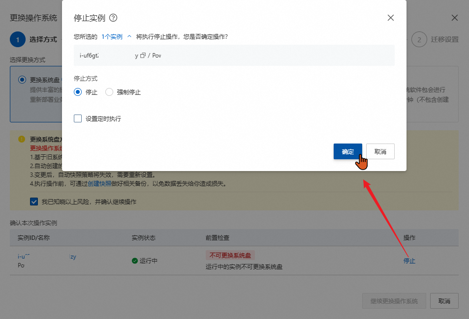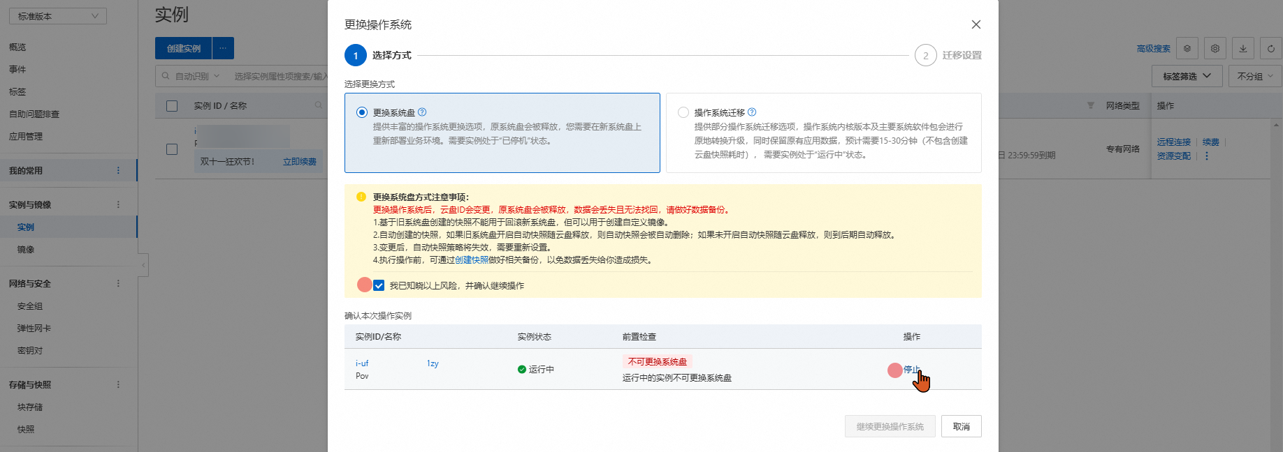 跟第二个步骤一样,停止服务器,点击继续更换操作系统