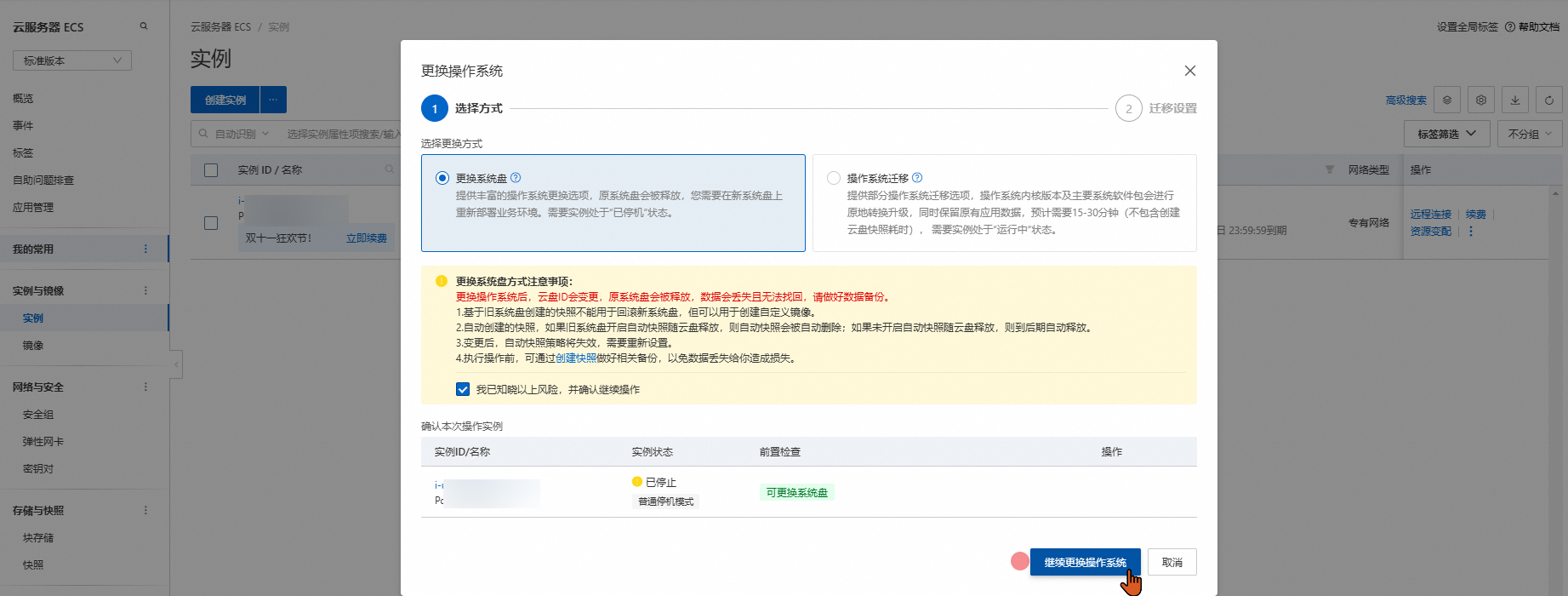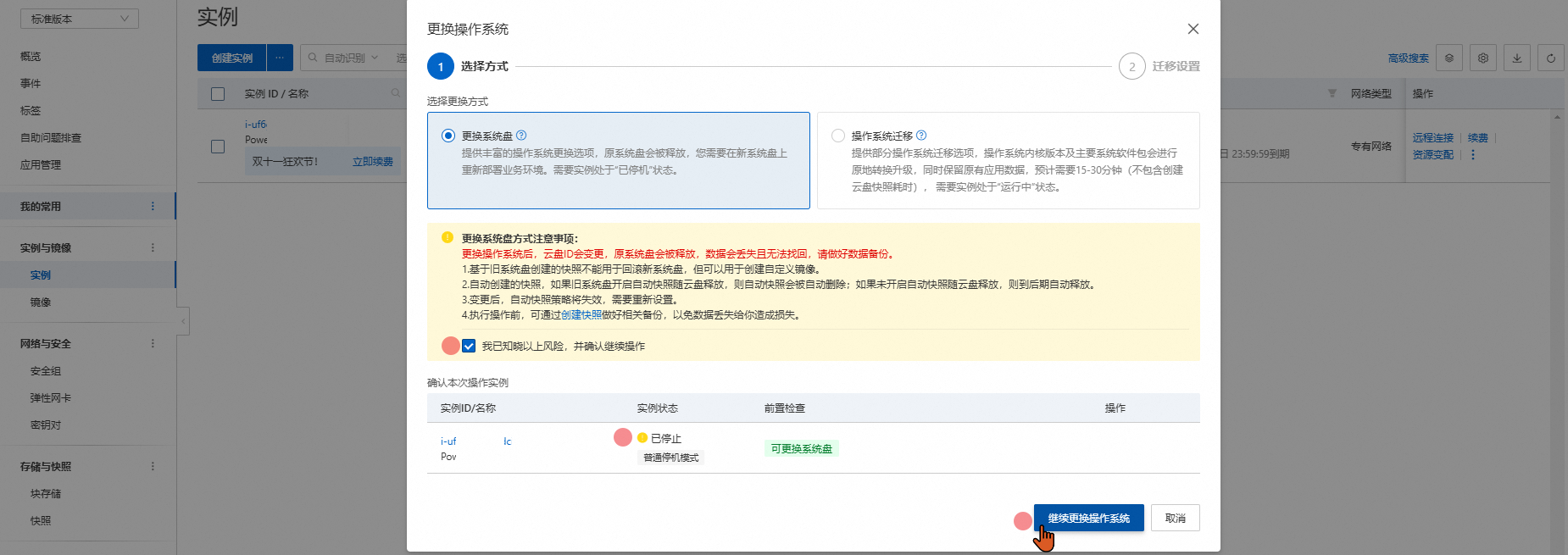 阅读风险内容,勾选,点击继续更换操作系统