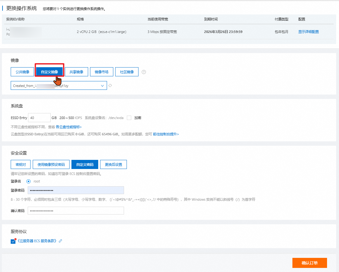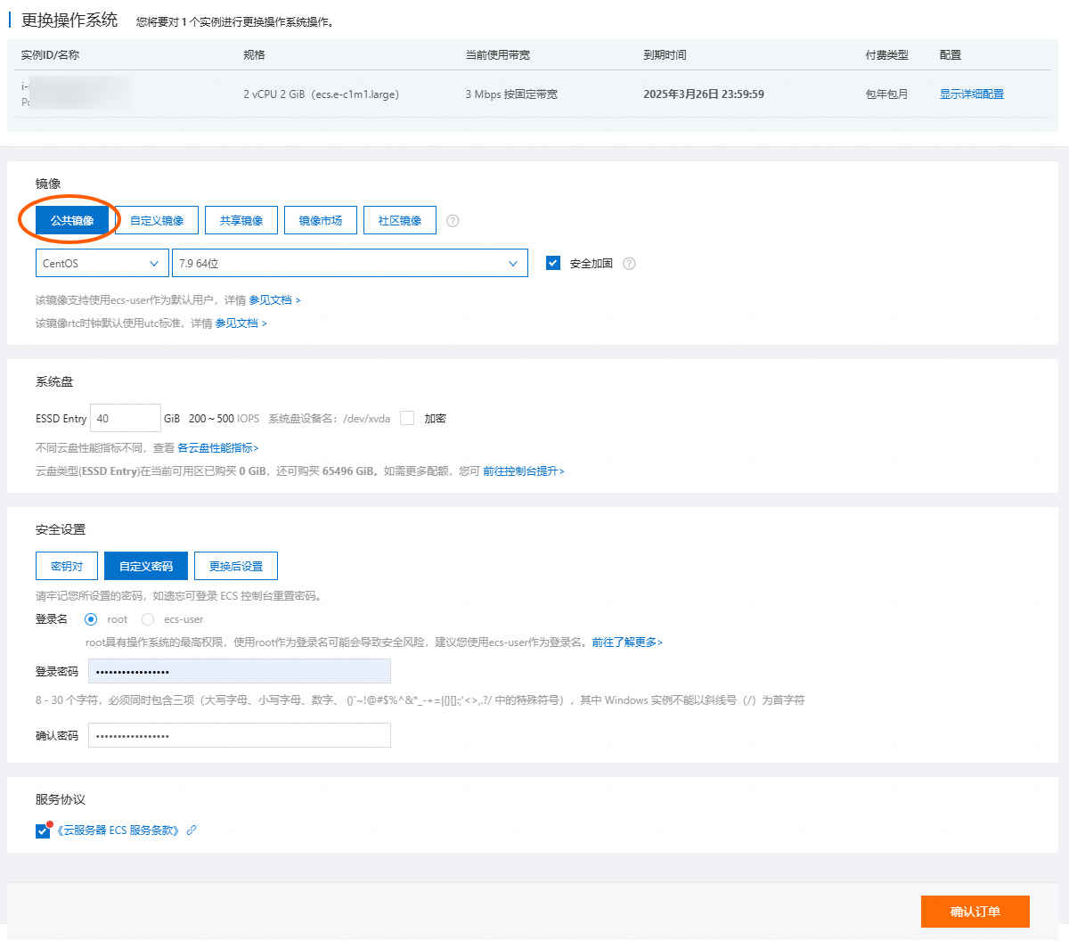 选择免费的公共镜像,选择系统,版本,密码等信息后,点击确认订单
