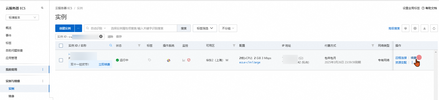 对服务器实例进行续费,点击右侧续费
