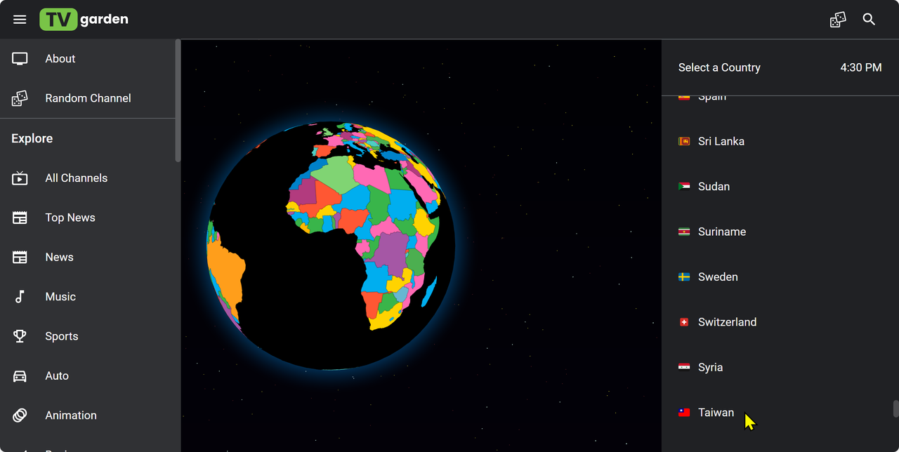 该网站采用交互式3D地球仪界面,方便观众按国家或类别轻松选择频道。并且无需注册账户,没有任何广告!