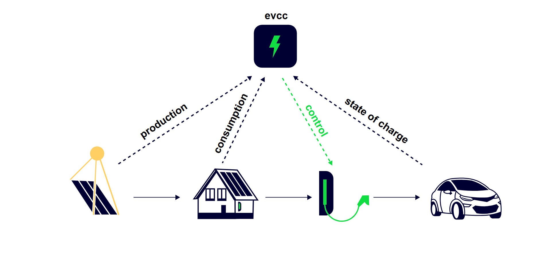 EVCC 的核心功能就是利用多余的太阳能给电动汽车充电,系统收集发电量、家用电池状态、电价、电动汽车充电状态等信息。