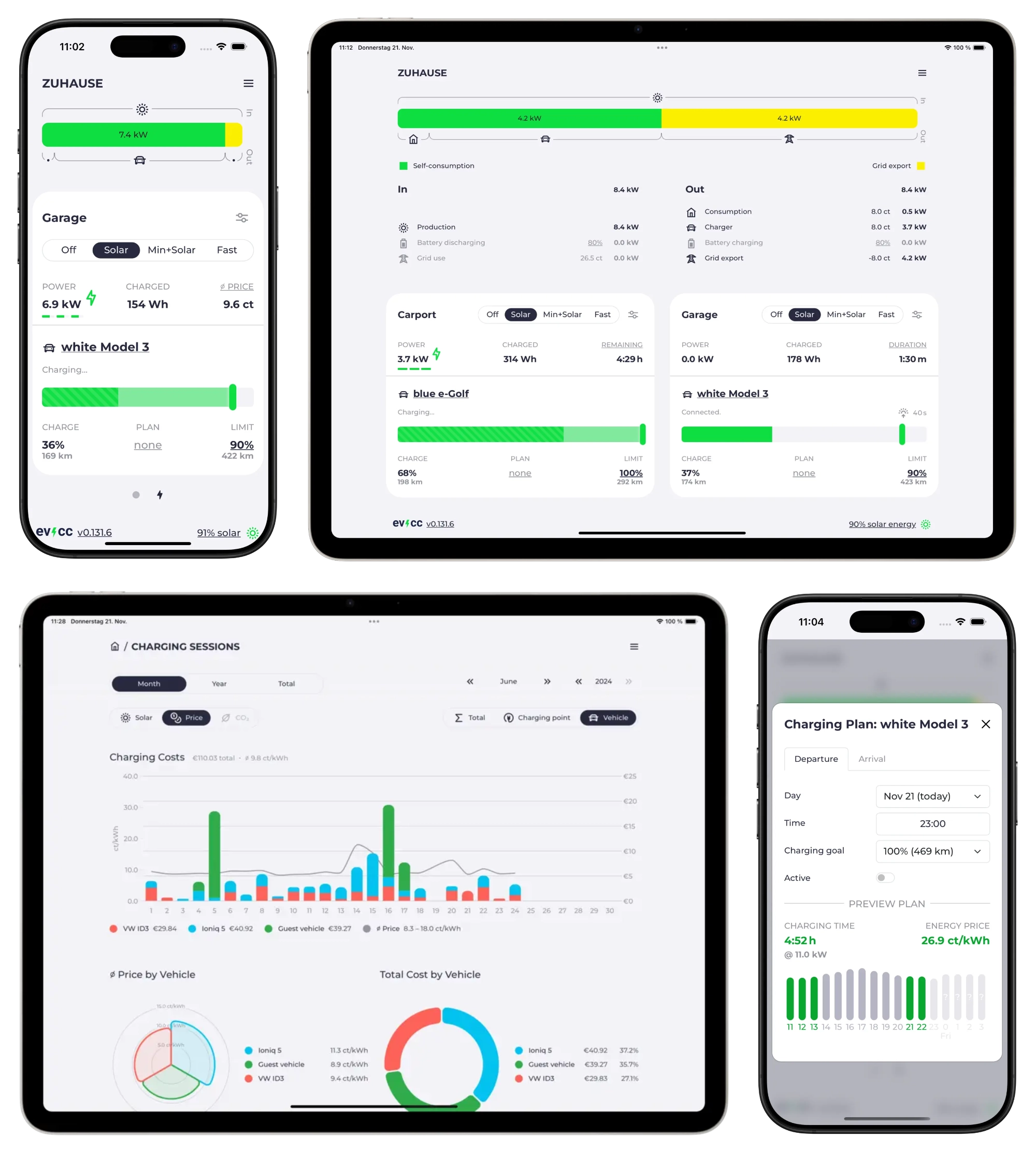 借助这些数据,evcc 可以控制您的电动汽车充电器,以最大限度地利用光伏剩余电量。如果您有动态电价,您可以定义充电计划或设置价格限制,并在最便宜的时间充电。