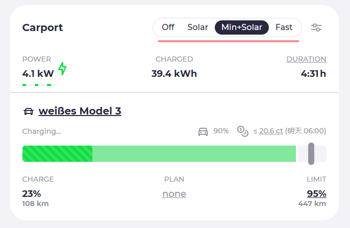 在这三种模式下,一旦达到设定的充电限制,充电就会停止。充电计划设定了达到特定充电限制的时间,并结合了太阳能和快速模式:车辆以剩余电量充电,并在最迟可能的时间启动快速模式以达到目标充电限制。如果您有电池,太阳能模式还允许您在电池和车辆充电之间设置优先级。