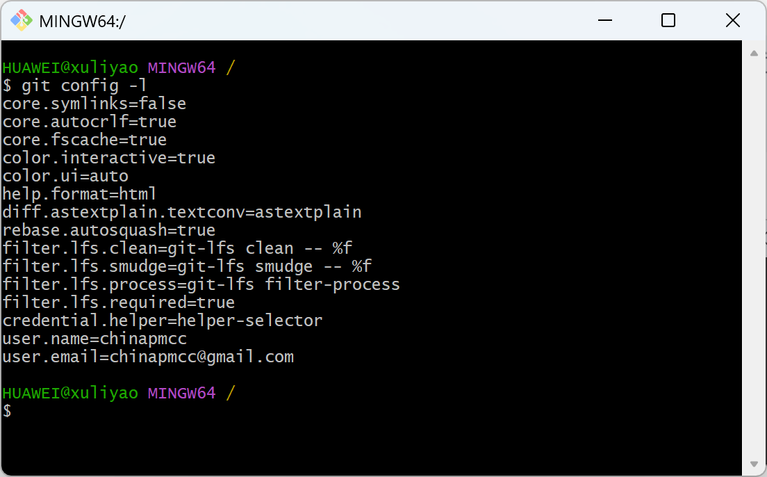 执行命令后,显示配置的用户名及邮箱,说明配置成功了