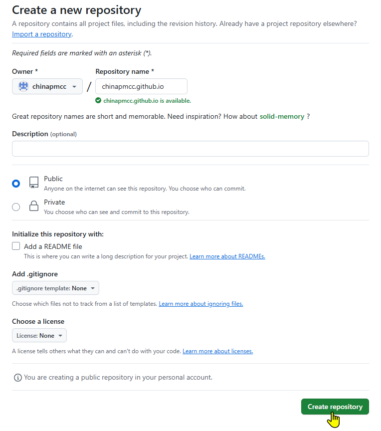 在github创建仓库,输入自定义仓库名要求<用户名>.github.io,点击Create repository
