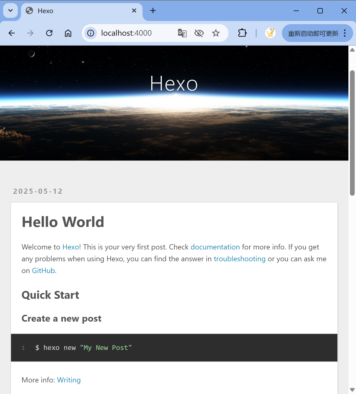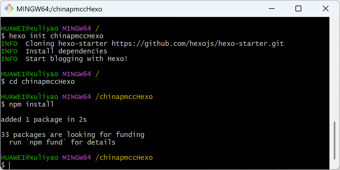 执行下列命令,Hexo 将会在指定文件夹中新建所需要的文件。