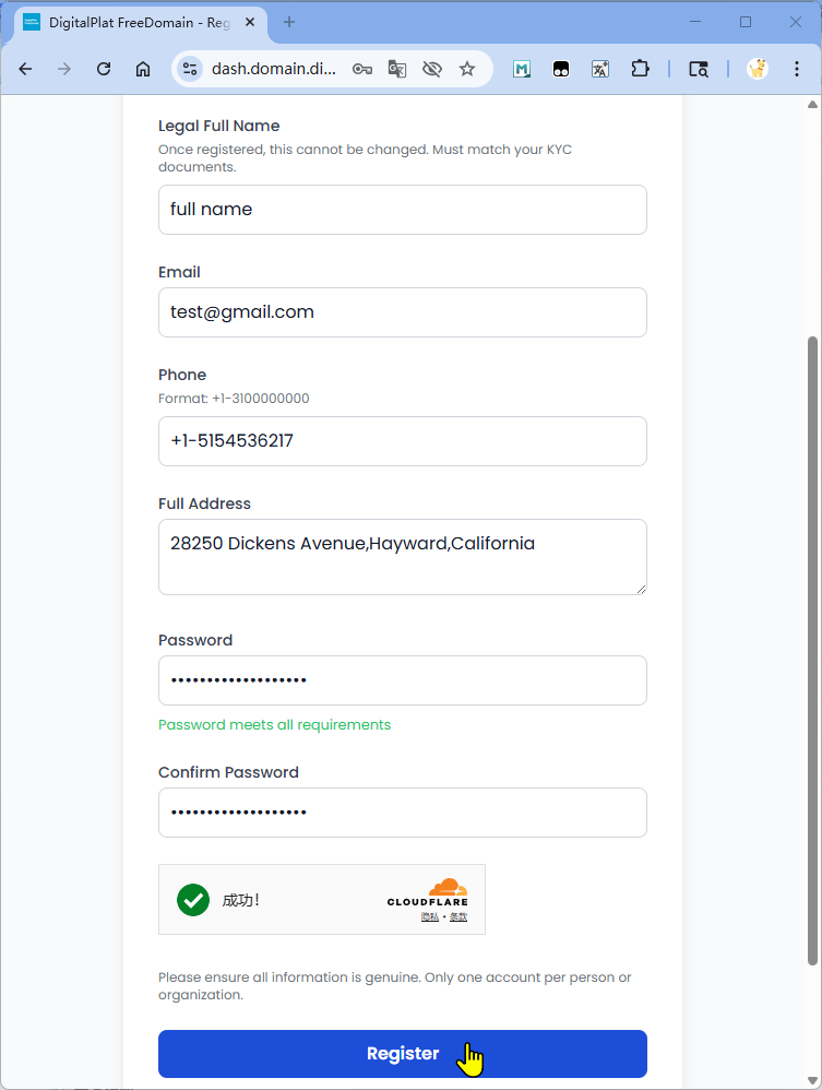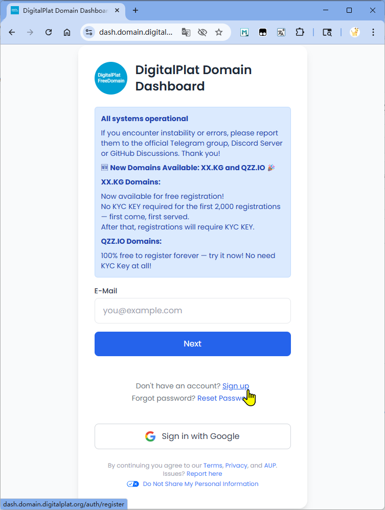 1.1 打开Digitalplat官网:https://dash.domain.digitalplat.org/auth/register