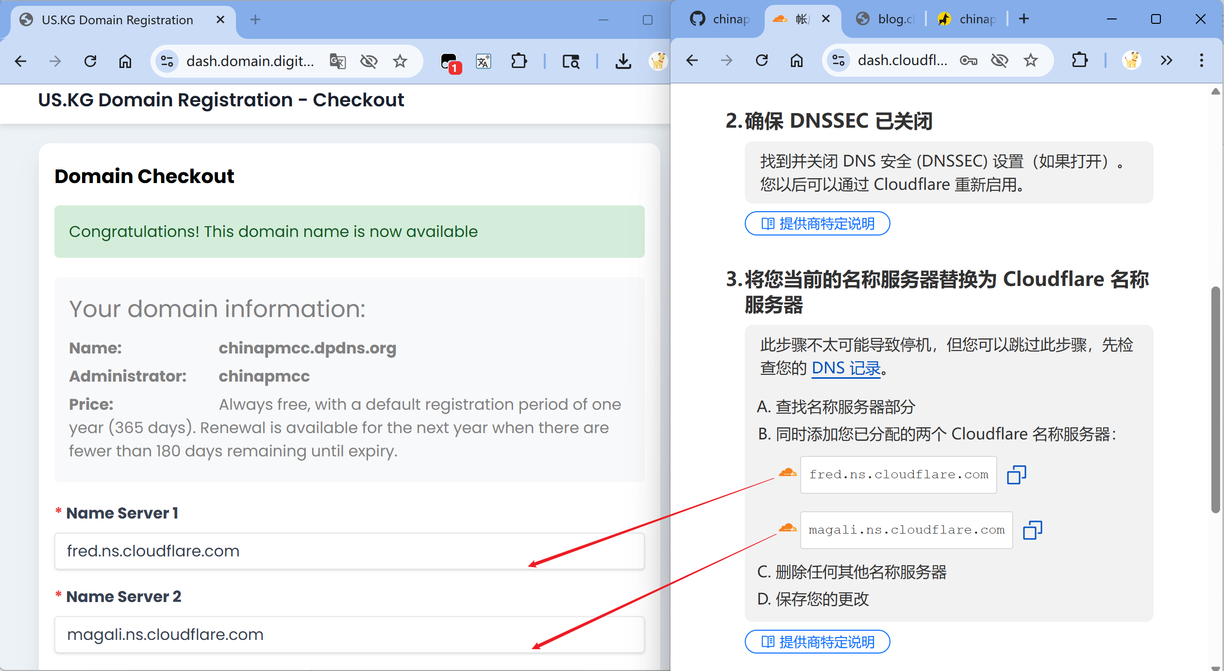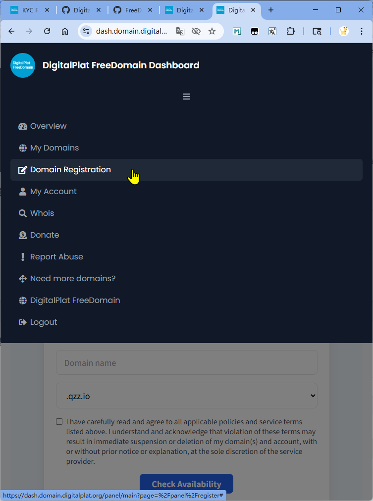 • 输入你的自定义域名+.dpdns.org,点击按钮:Check Availability