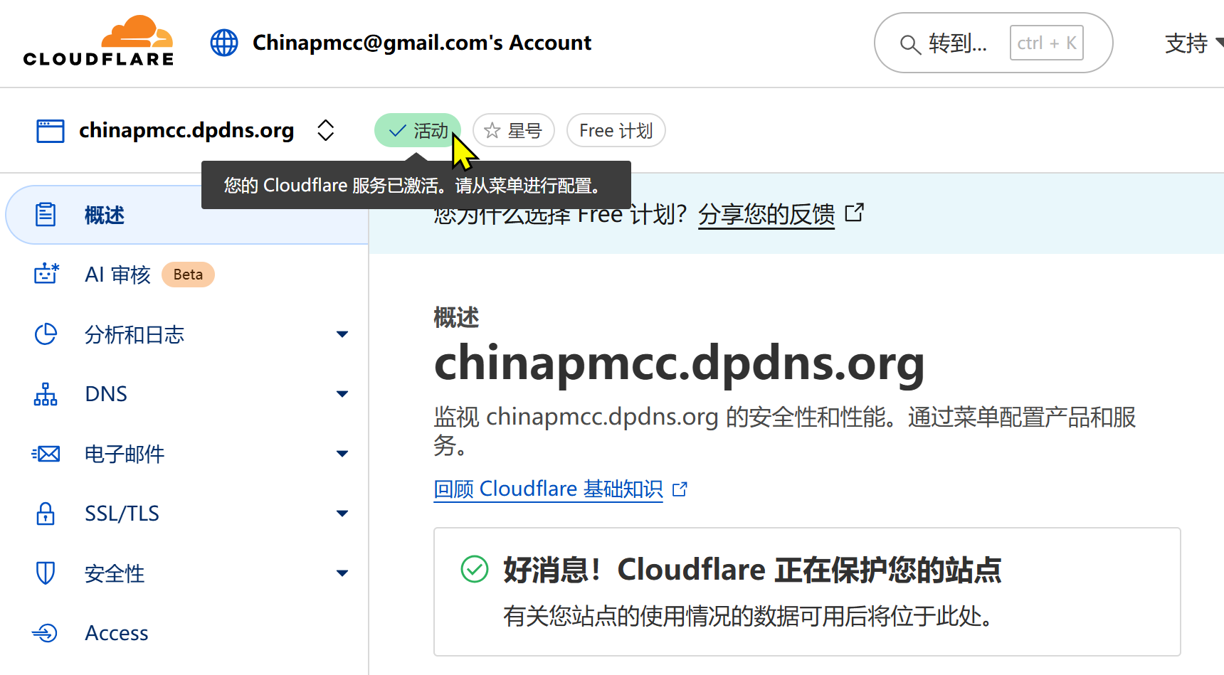• 在Coudflare中点击立即检查名称服务器,返回刷新后状态为活动即表示成功,已由Coudflare托管。