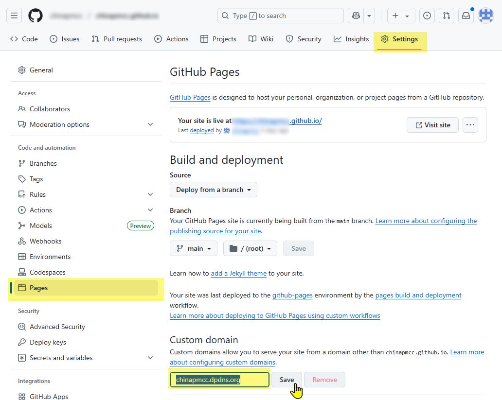 Settings→Pages→Custom domain(输入你的自定义域名)→Save