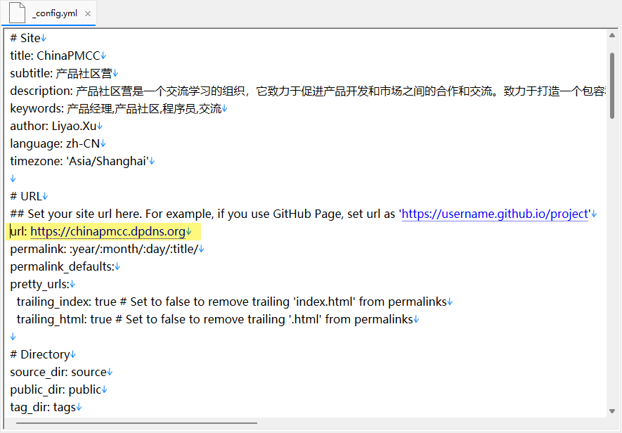 3.4 Hexo的配置文件_config.yml的url也改成你的自定义域名,然后保存发布。