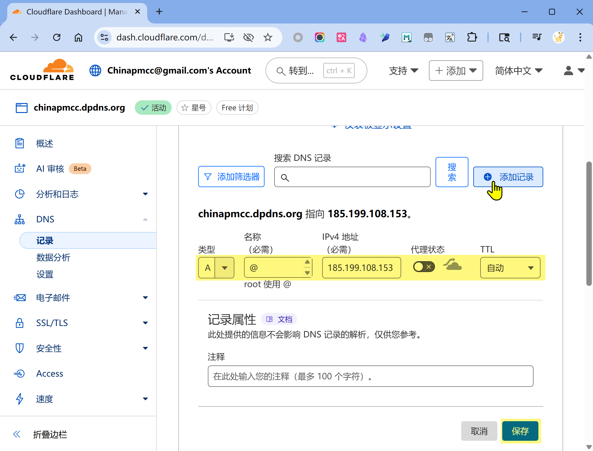 3.2 将上述8个地址添加到Cloudflare的DNS中,代理状态先不开启(最后步骤开启)