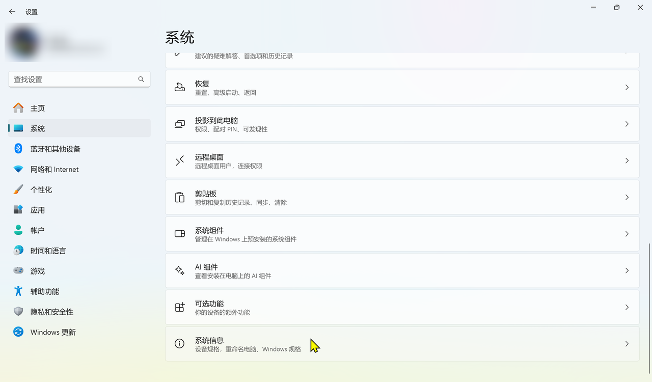快捷键:Win+i,点击系统→系统信息