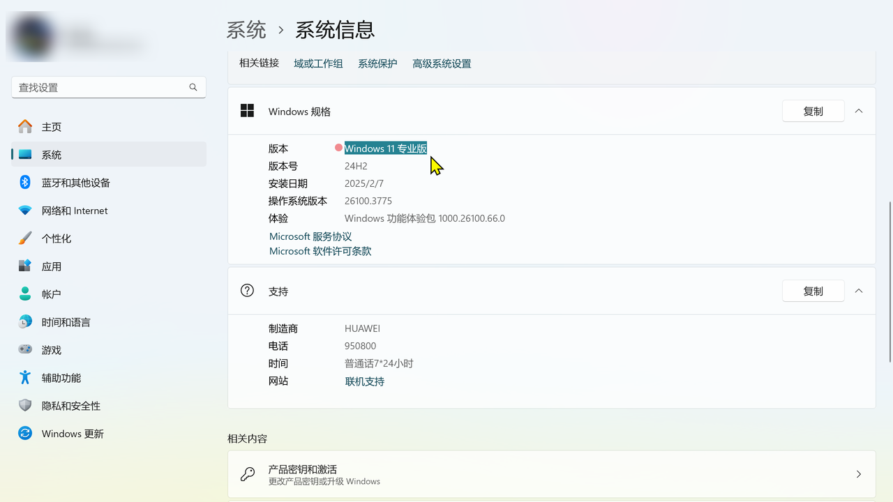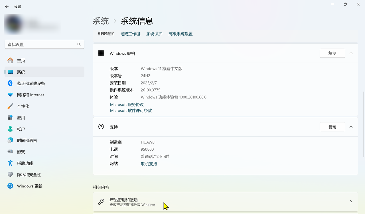 点击产品密钥和激活,当前系统版本为Windows 11 家庭中文版