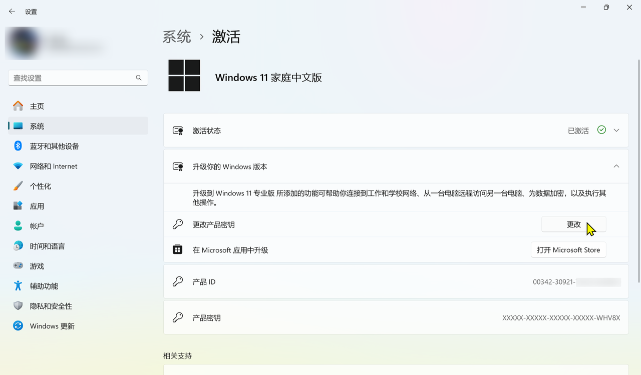 3. 更改产品密钥,点击更改