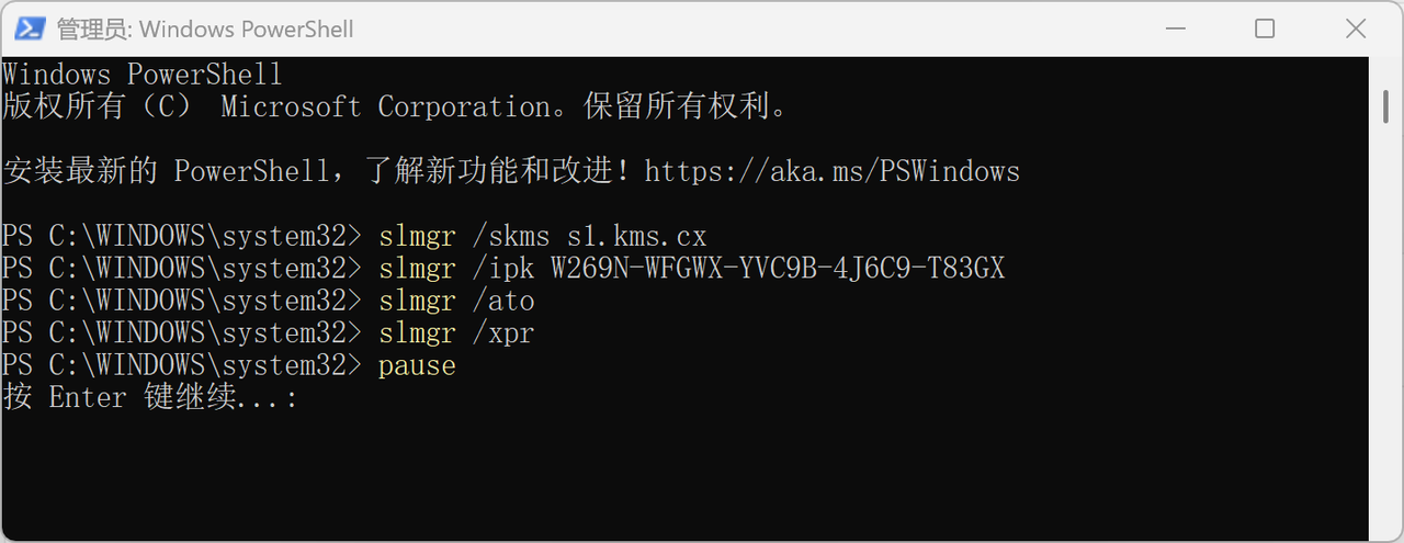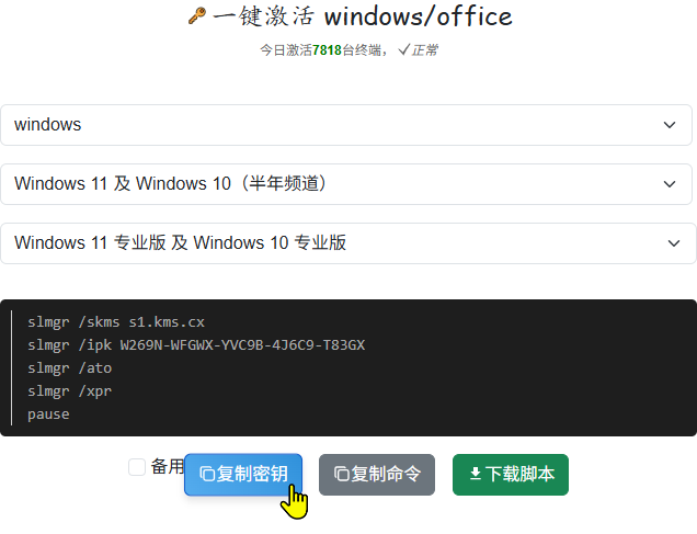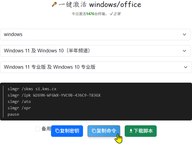 | 打开网站,选择对应的版本,然后点击复制命令 | 用管理员打开PowerShell,鼠标右键粘贴命令,即完成 会弹窗提示正在激活,安装成功 屏幕右下角激活Windows水印消失 |