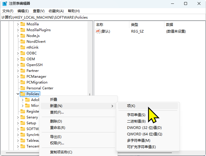 HKEY_LOCAL_MACHINE\SOFTWARE\Policies\Google\Chrome,如果Google或Chrome项不存在,则依次创建它们。