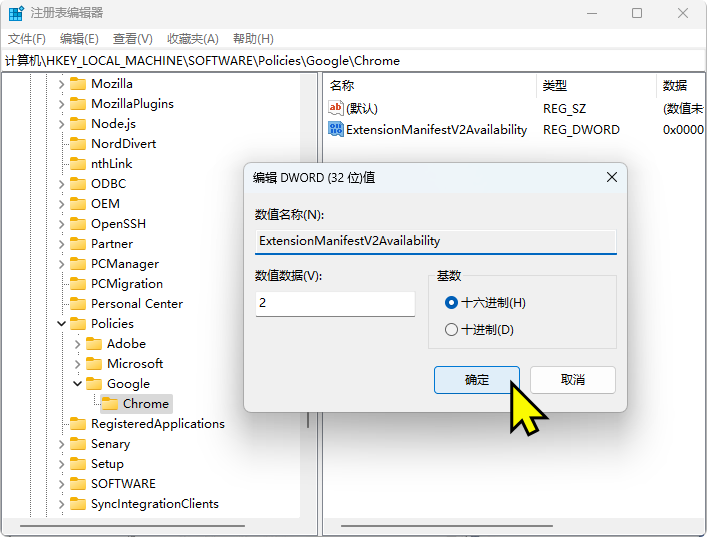 Chrome项下新建一个32位DWORD值,名称为ExtensionManifestV2Availability,值设为2。