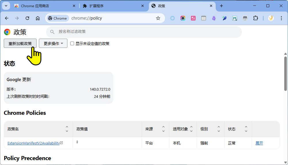 chrome://policy/,点击“重新加载政策”,确认策略生效。