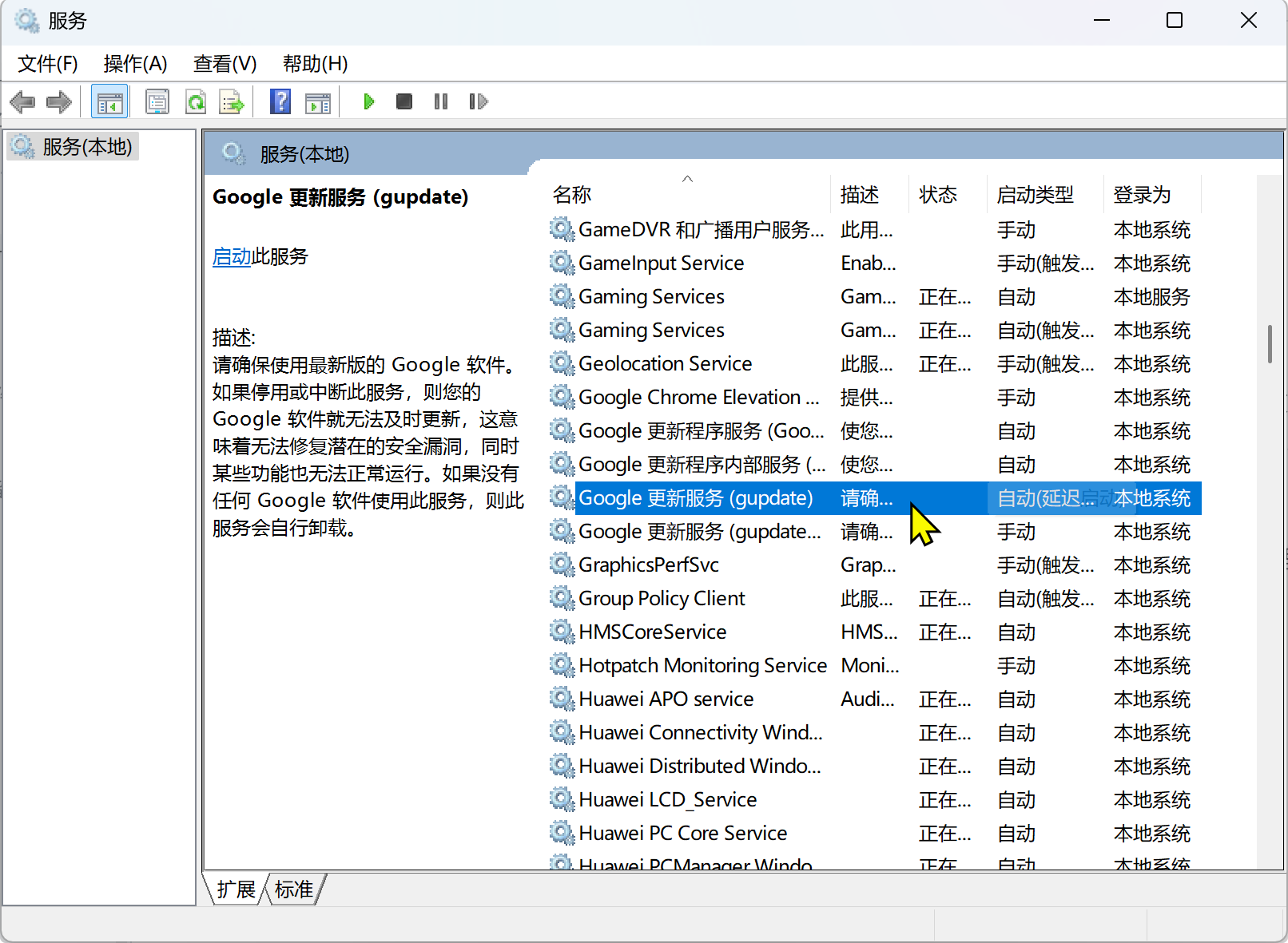 services.msc回车,打开「服务」管理器。 - 选择GoogleUpdater,双击将「启动类型」设置为「禁用」。