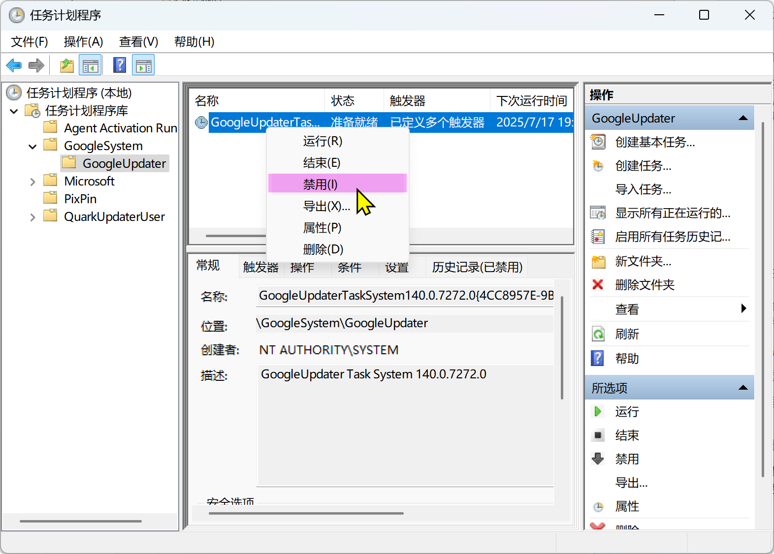 taskschd.msc回车,打开「服务」管理器。 - 左侧任务计划中选择GoogleUpdater,右键将该列表中的所有任务计划禁用。