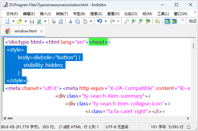 找到Typora安装目录,打开Typora\resources\window.html文件 在< head > 标签后加上以下代码: