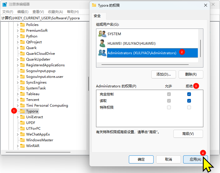 右键Typora,选择Administrators,勾选拒绝,点击应用。