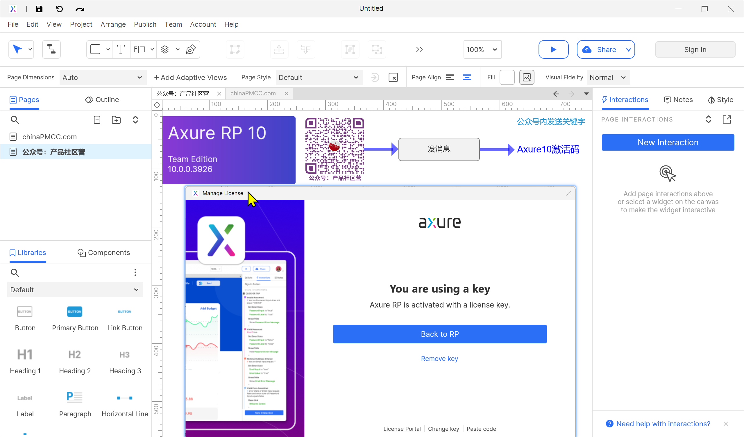 微信公众号(chinapmcc)中发消息,输入关键字获取:Axure11激活码