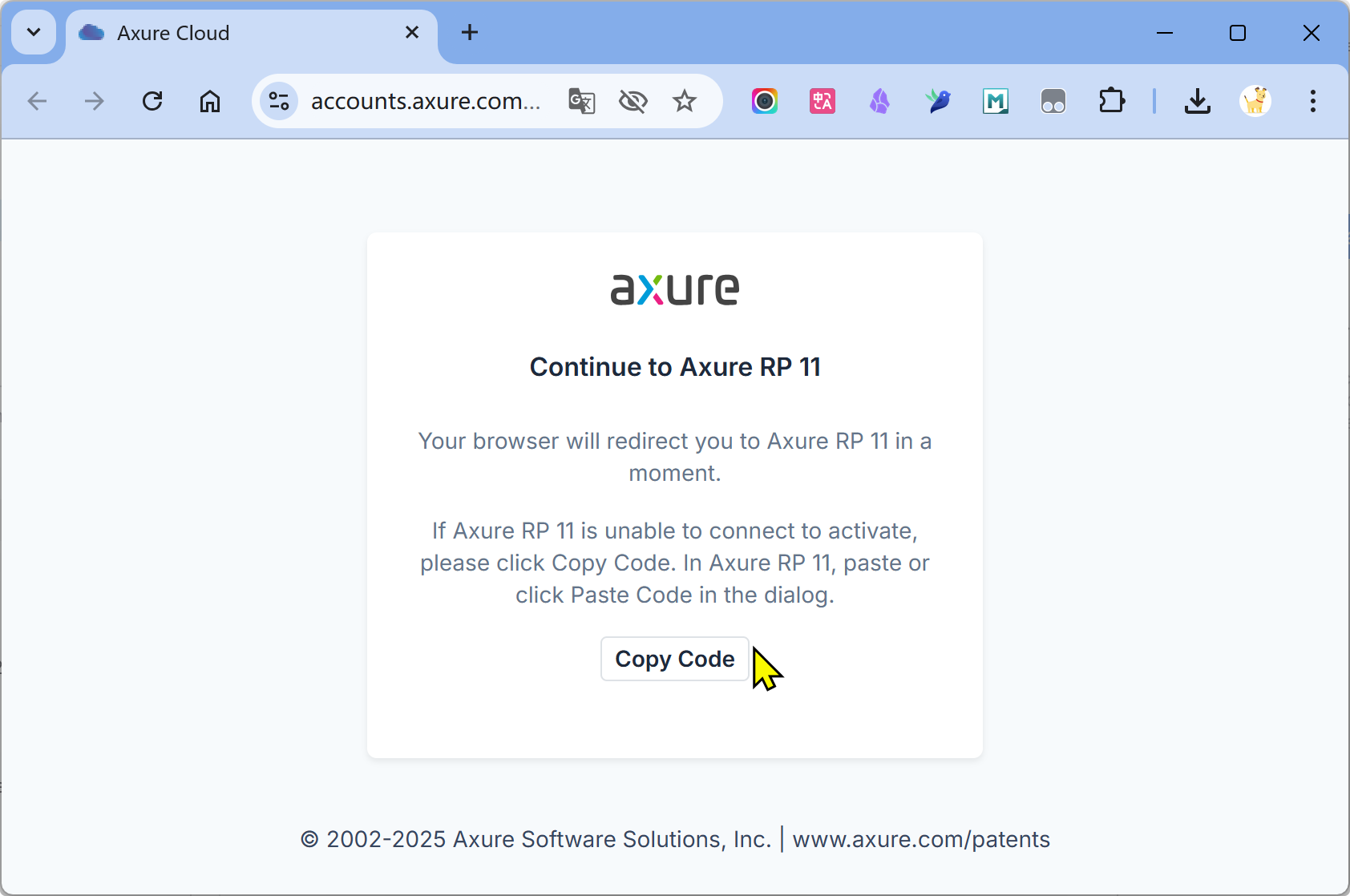 如果Axure RP 11无法连接以激活,请点击Copy Code复制代码。在Axure RP 11中,粘贴或点击对话框中的Paste code粘贴代码。