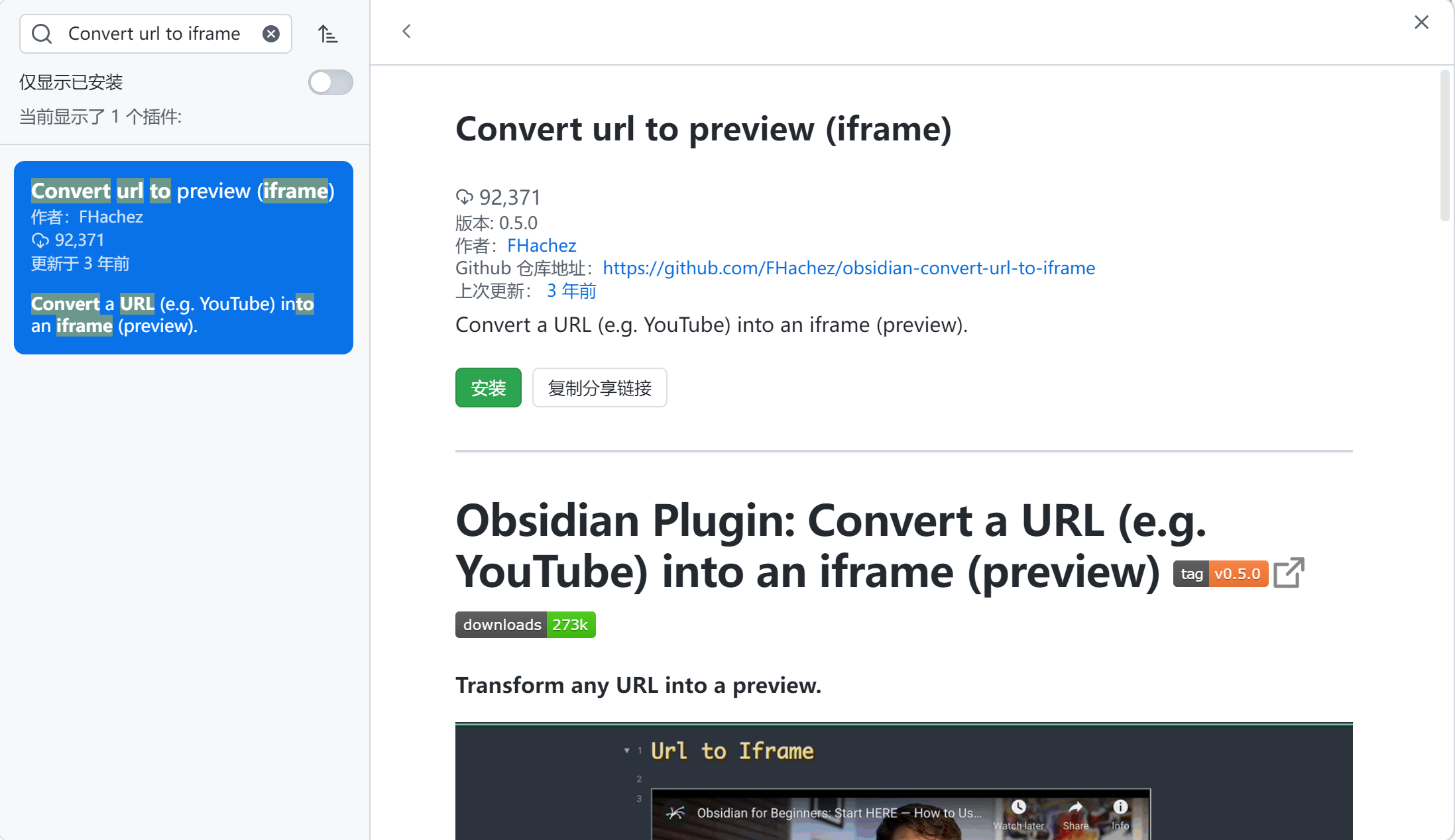 Github仓库地址:https://github.com/FHachez/obsidian-convert-url-to-iframe