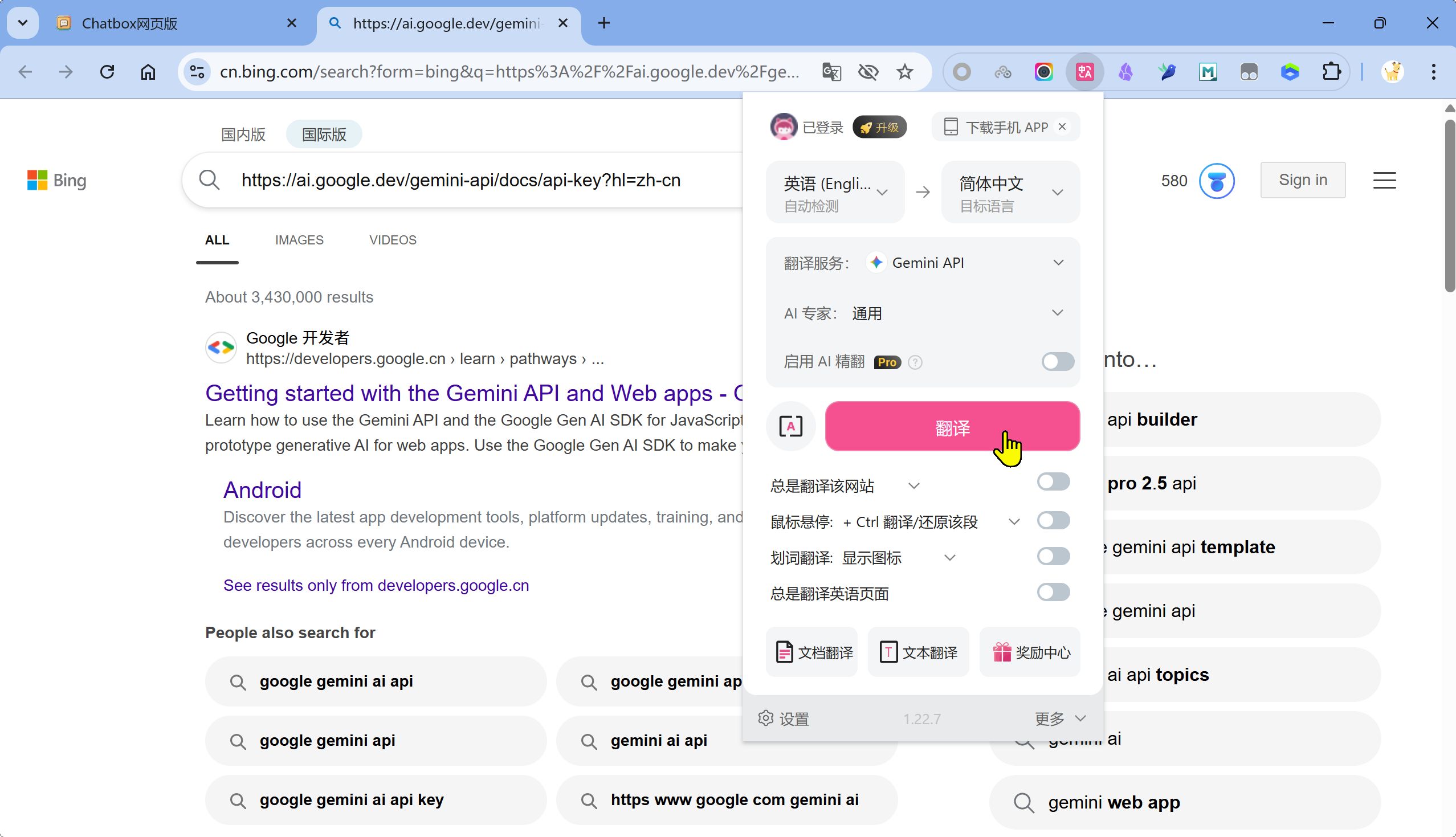 沉浸式翻译图标,翻译服务选择设置好的Gemini API,点击翻译即可翻译网站。