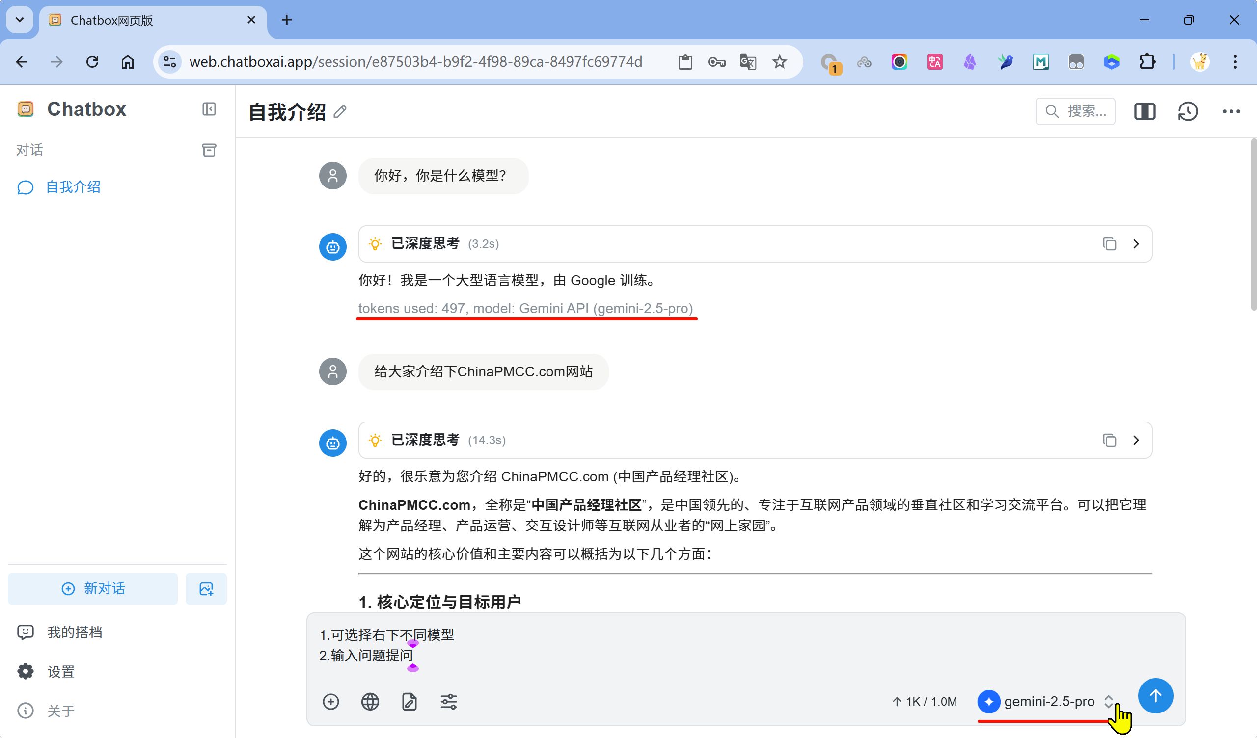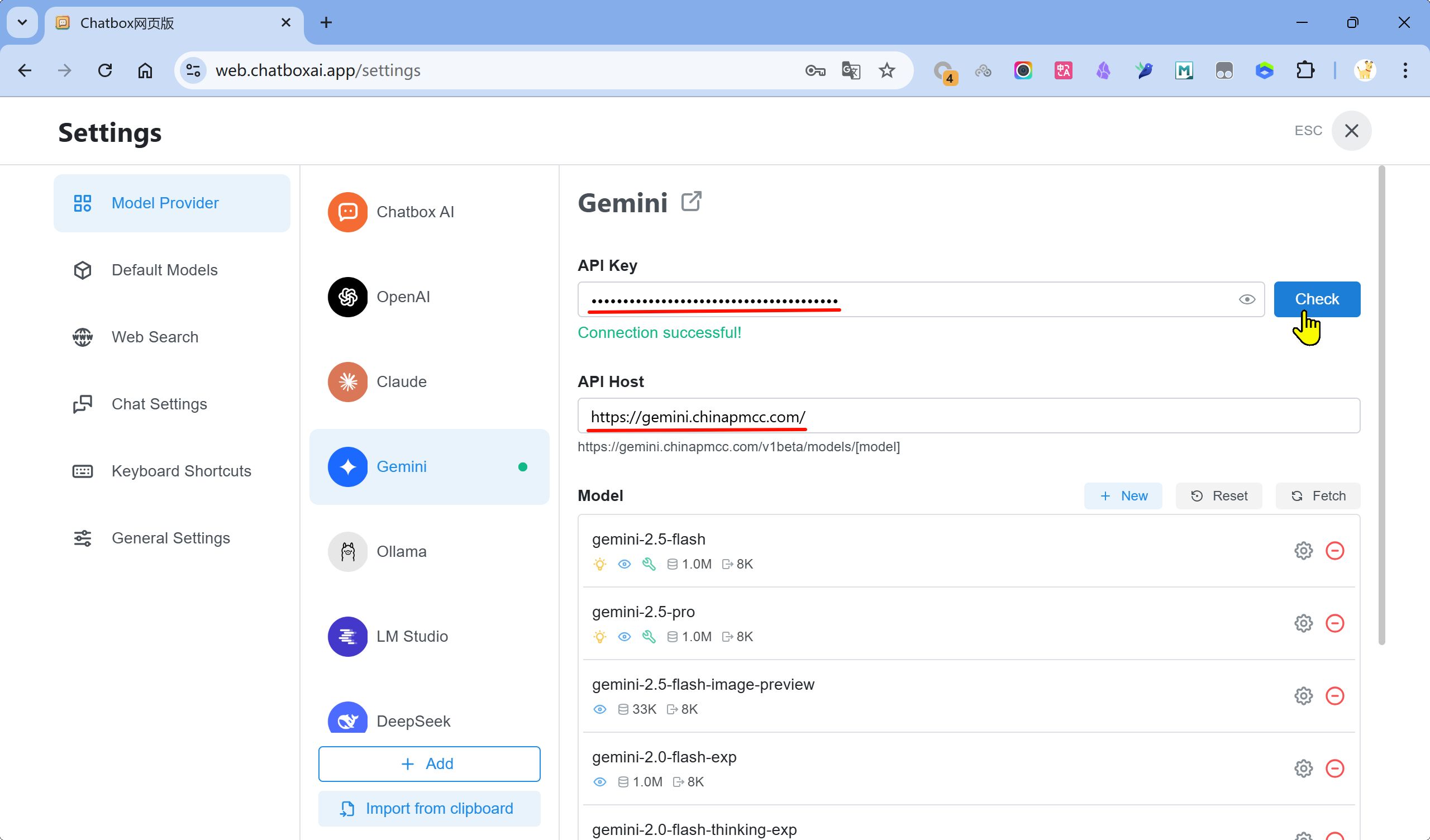 验证并应用,配置时用到两个东西:API KEY、API 地址 经过上述配置,就可以使用Gemini了,下面通过两个应用例子验证,在其他应用中使用也是一样的方法。