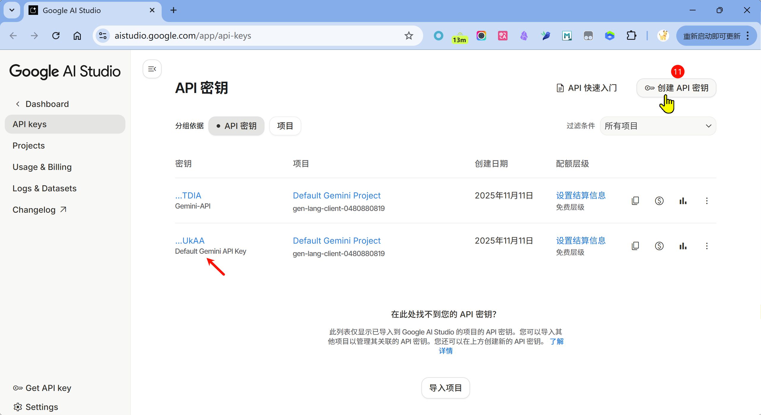 生成Google AI的API密钥,需要梯子,保存生成的API KEY 。