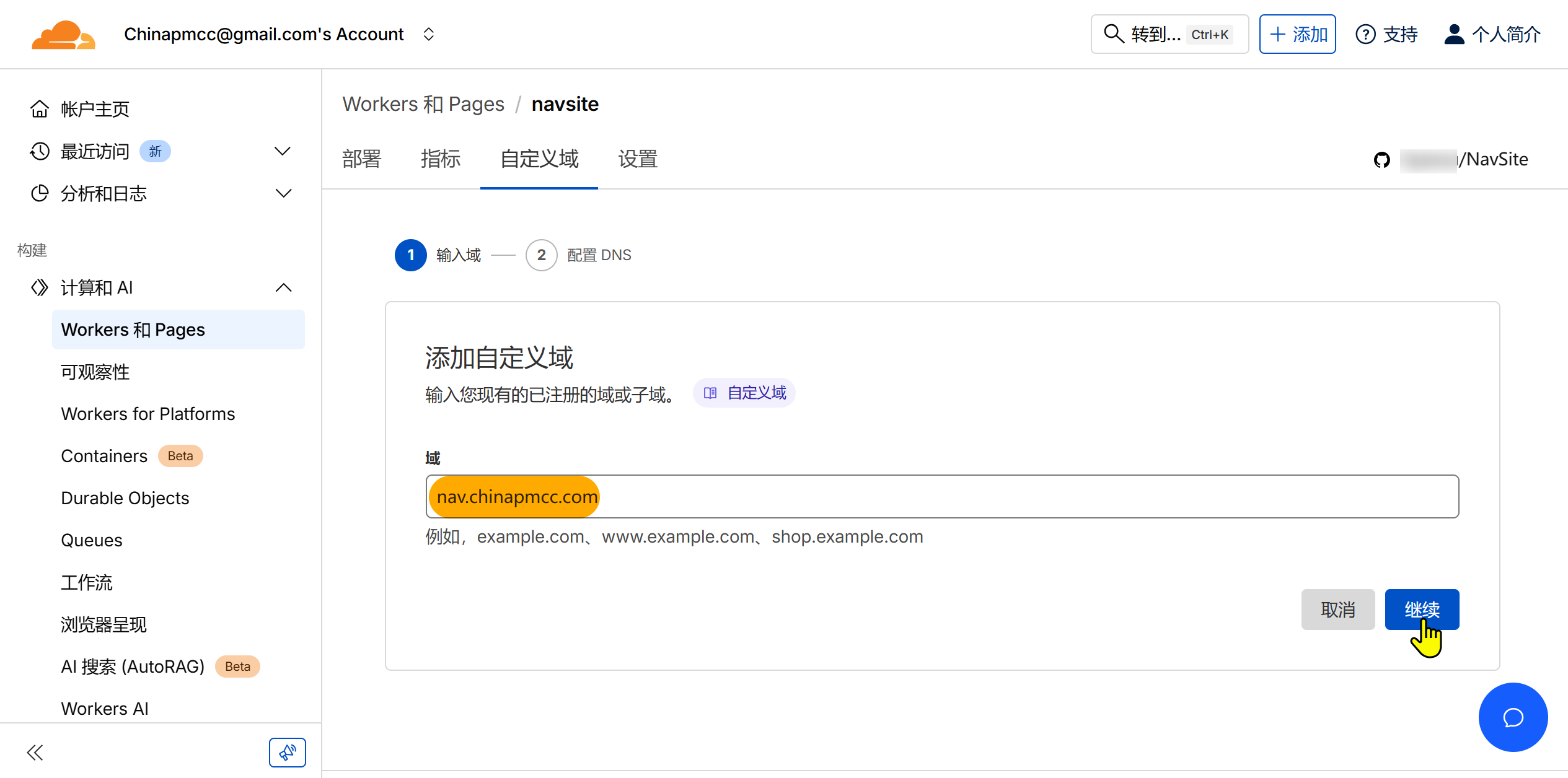 nav,点击继续,会自动生成DNS CNAME 记录。