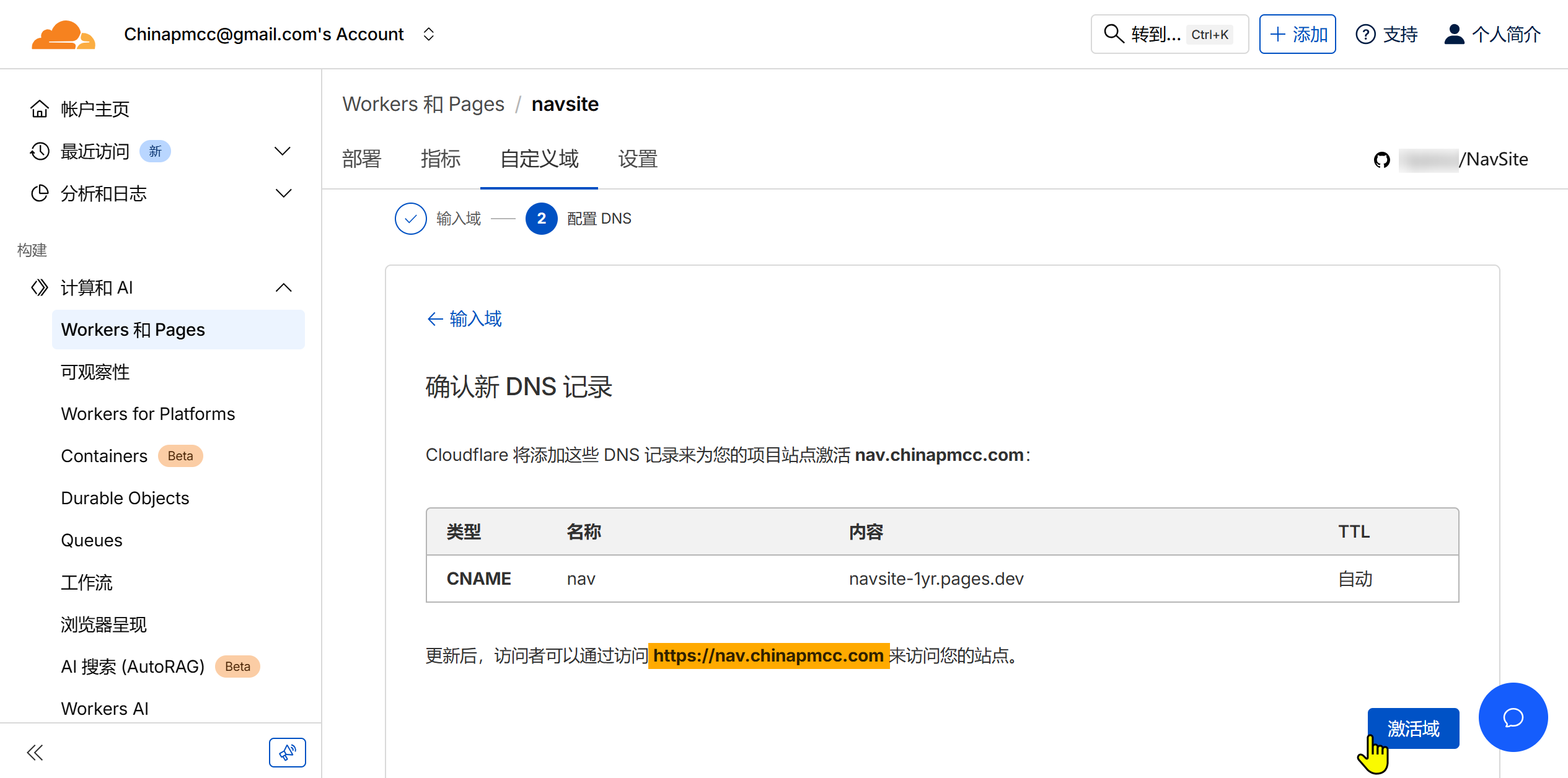 激活域,即可使用自定义域名进行访问:nav.chinapmcc.com