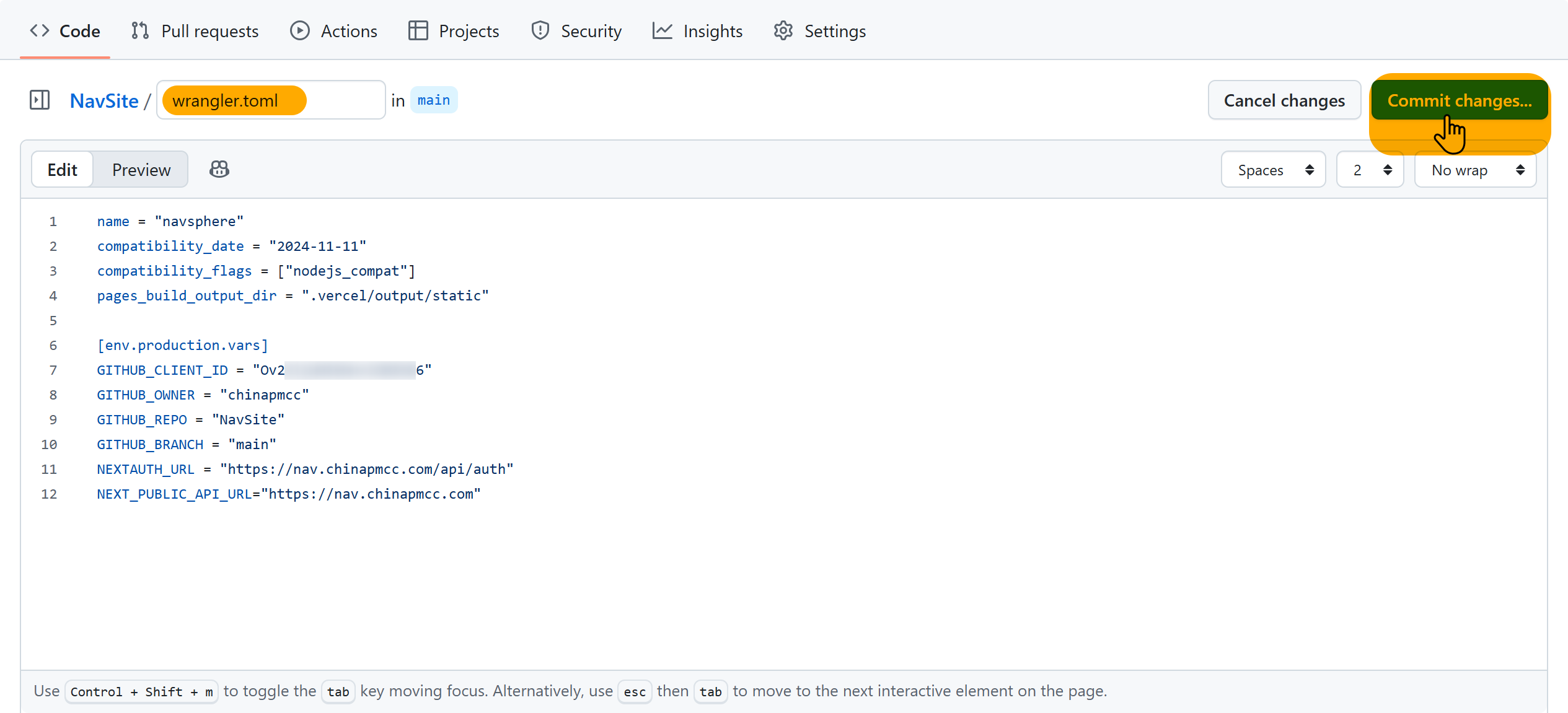 wrangler.toml,文件修改配置如下,点击Commit changes