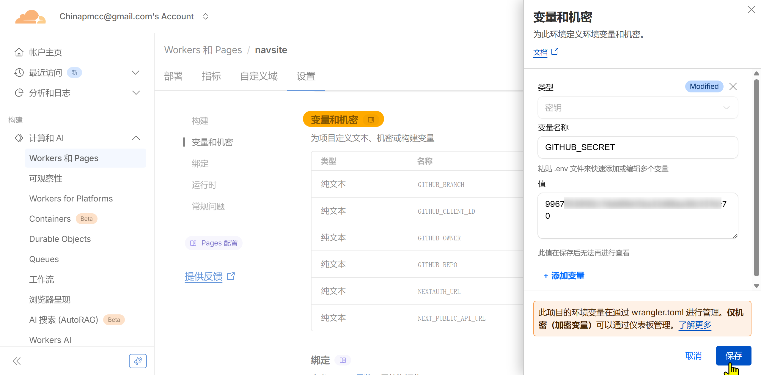 设置→变量与机密→ 点击”添加”。将GitHub OAuth App 的 Client Secret值粘帖并保存,重新部署。
