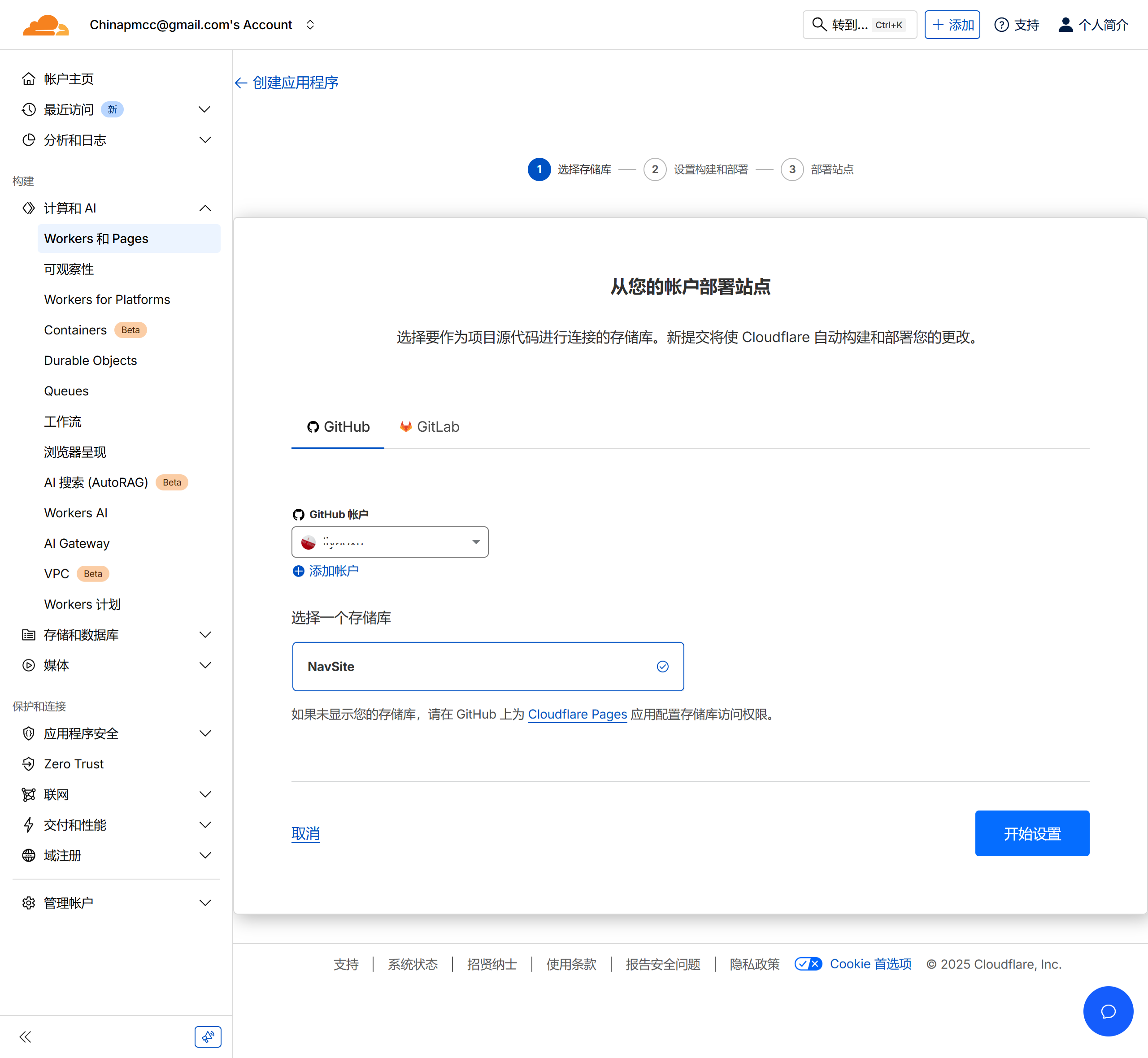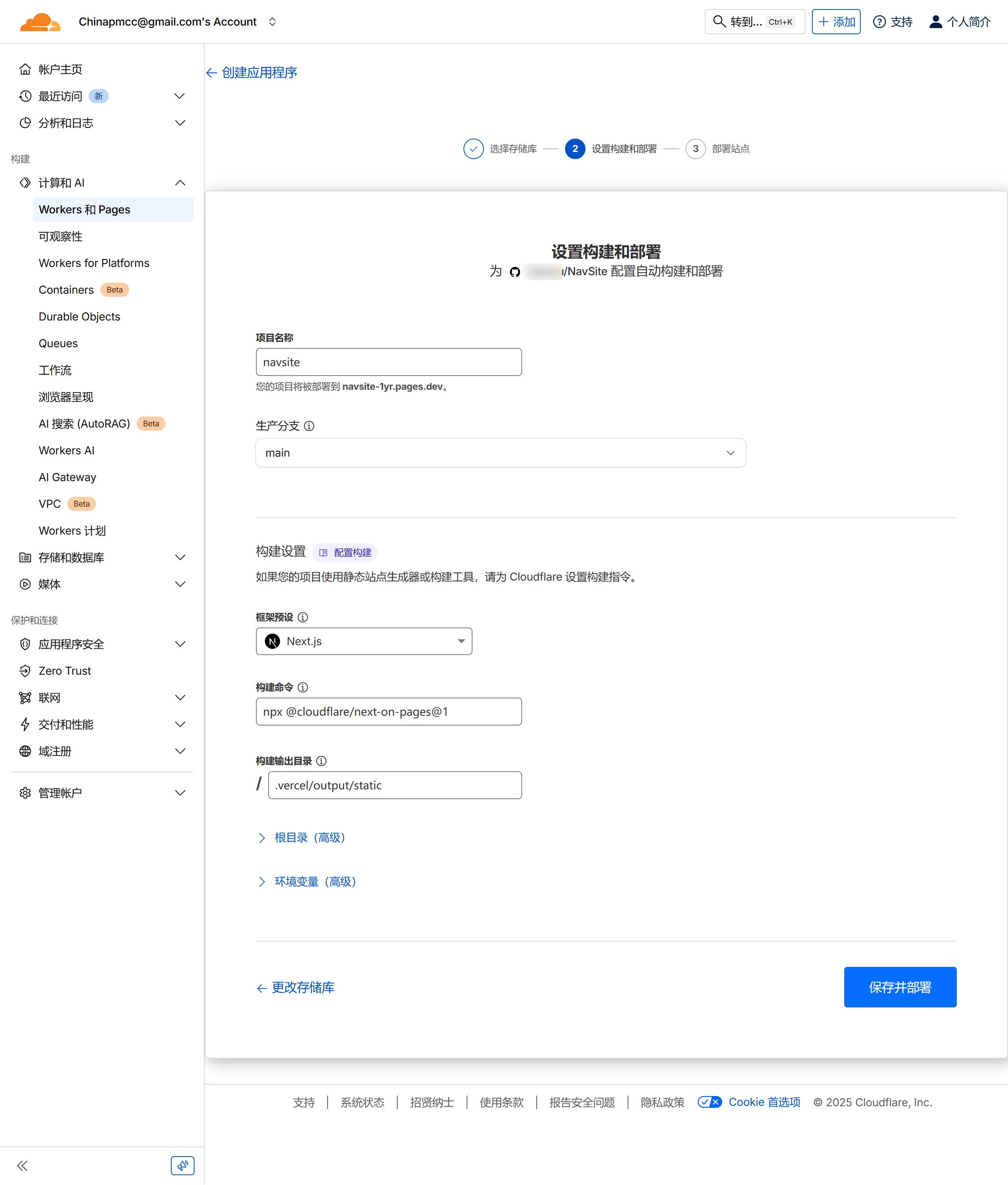 navsite、生产分支=main、框架预设=Next.js、构建命令=npx @cloudflare/next-on-pages@1、构建输出目录=.vercel/output/static,点击保存并部署