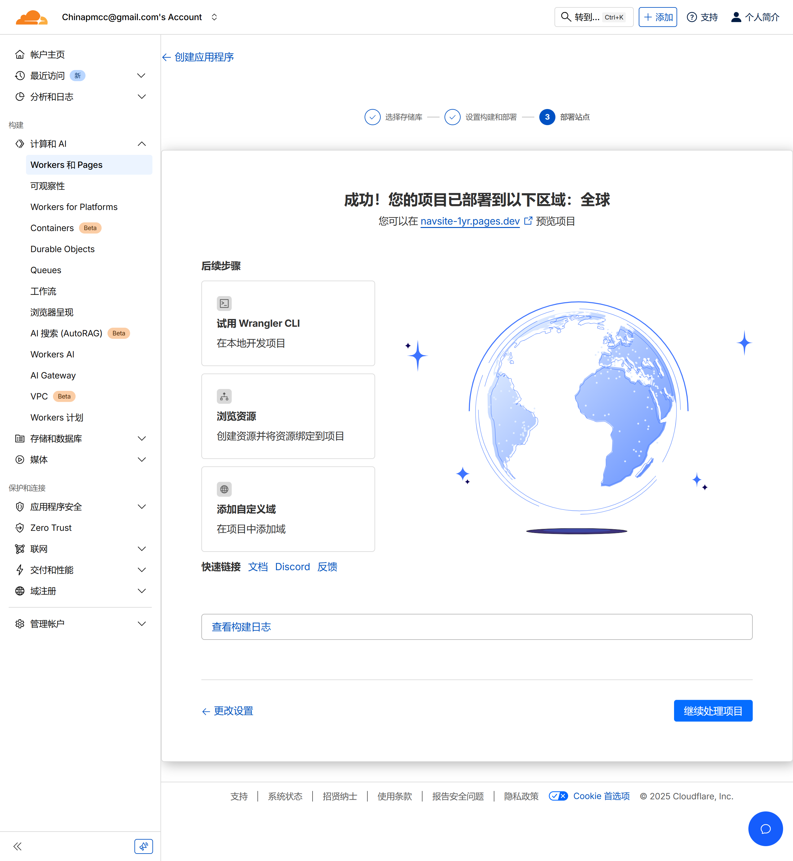 - Cloudflare Pages 将开始构建你的项目,并将其部署到 Cloudflare 的 CDN,等待2~3分钟后,显示成功,前端即可用域名访问了。